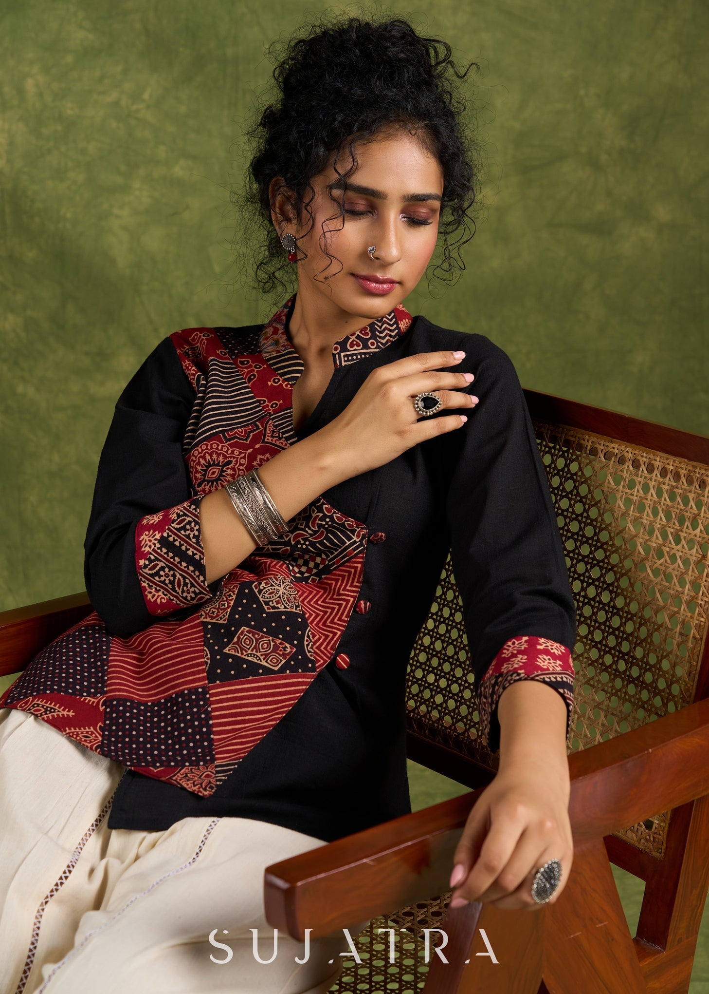Trendy Black Ajrakh Patch Work Cotton Top - Pant Optional