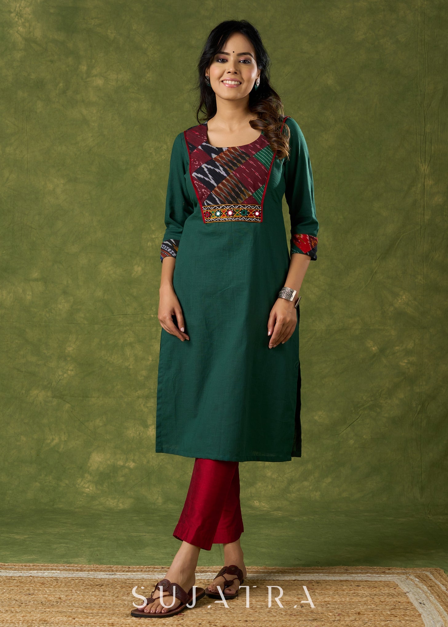 Trendy Bottle Green Cotton Patch Work Yoke Kurta With Kutch Mirrorwork - Pant Optional