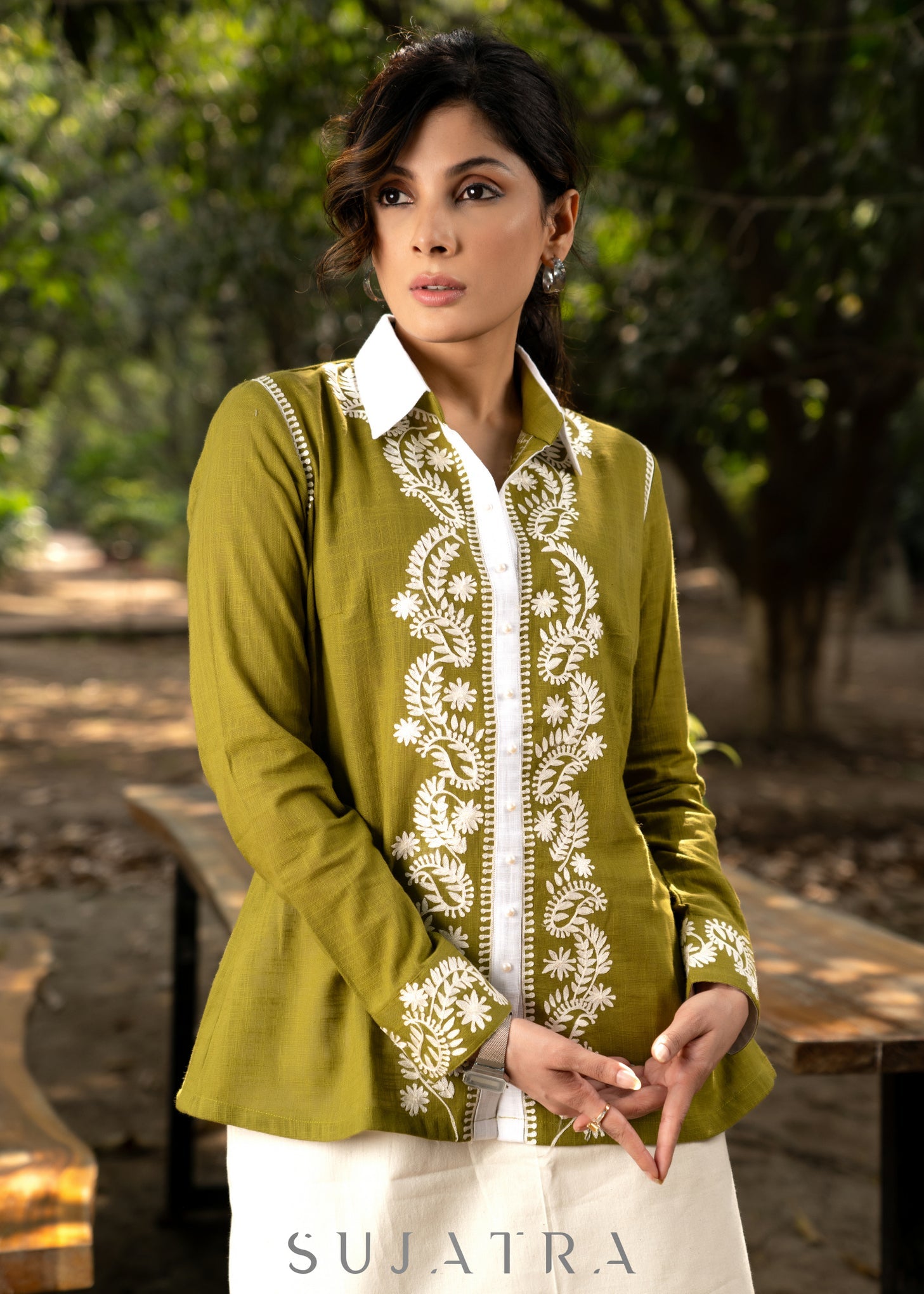 Trendy Moss Green Cotton Embroidered Shirt with Chikankari Inspired Embroidery