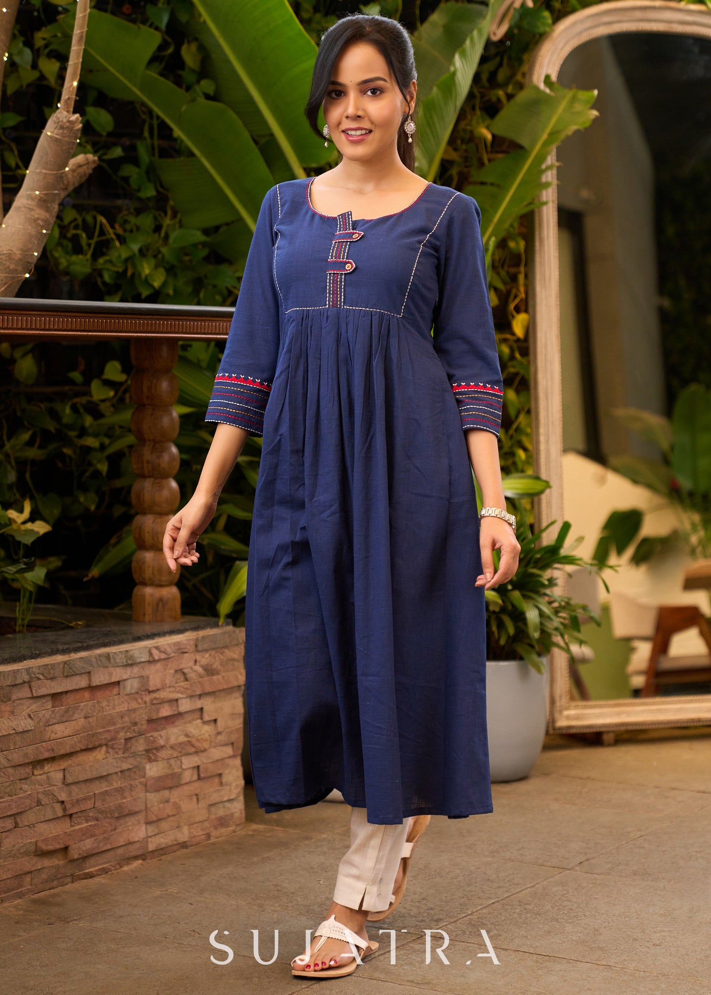 Trendy Navy-Blue Cotton Kurta with Embroidery in Front & Back - Pant Optional
