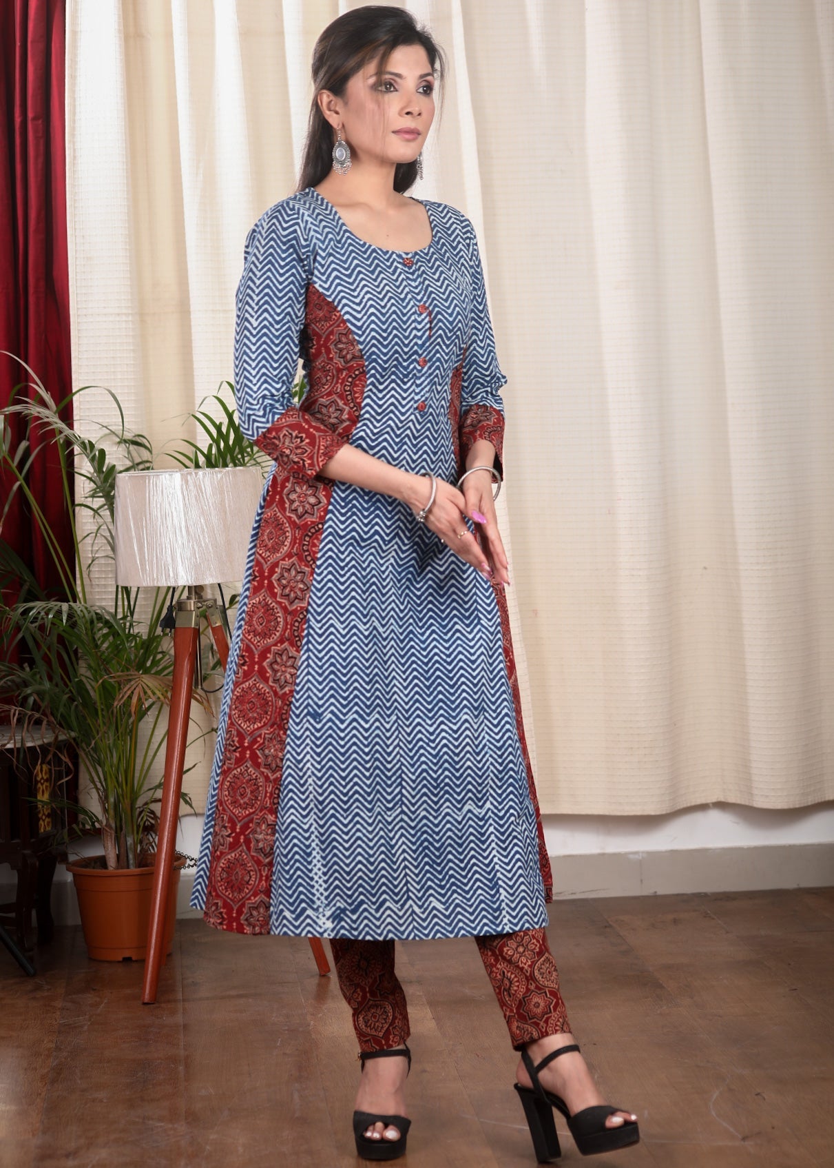 Unique A Line Pure Cotton Indigo and Ajrakh Combination Kurta