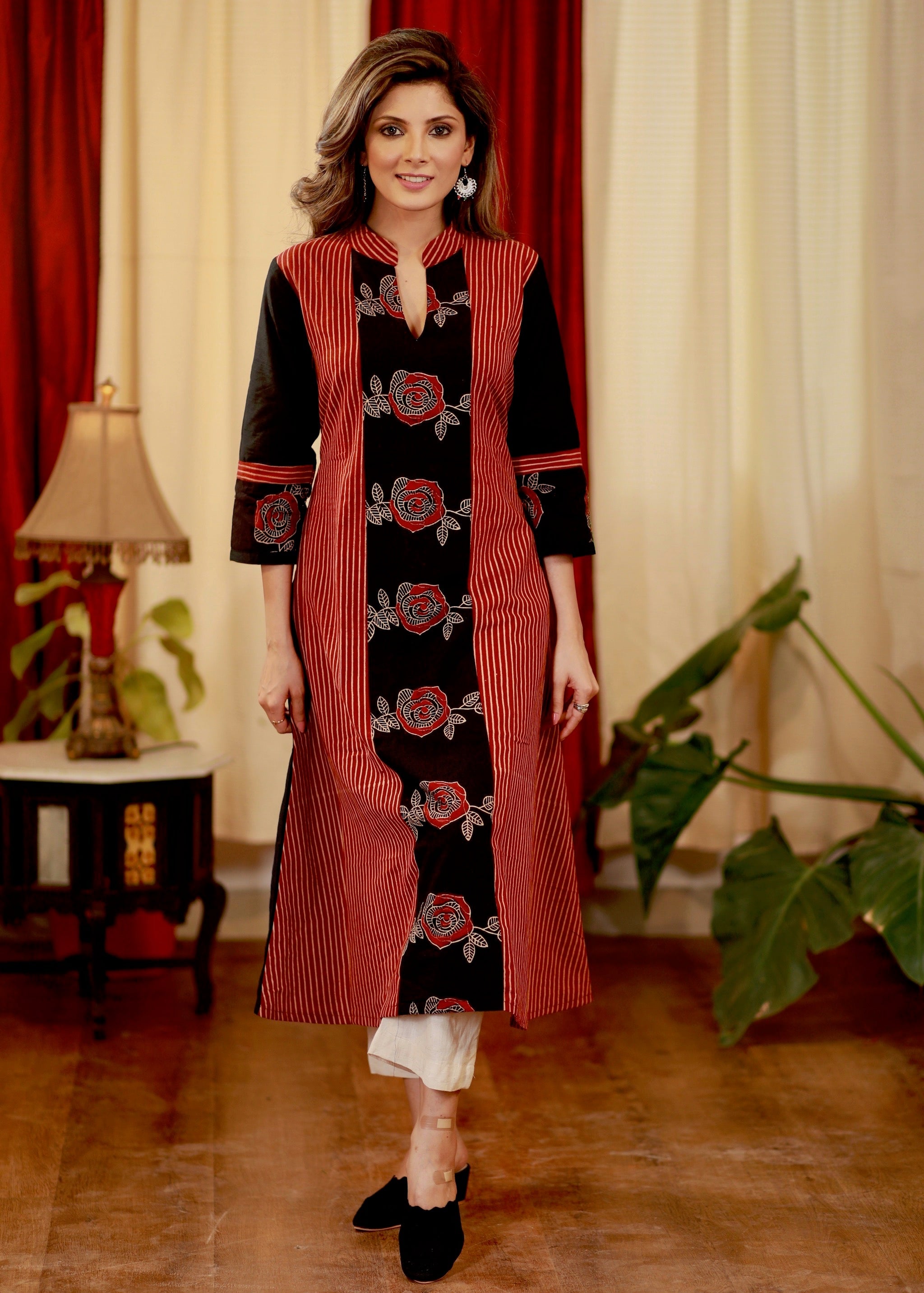 A- line Cotton Ajrakh Kurta with Contrast Ajrakh panelA