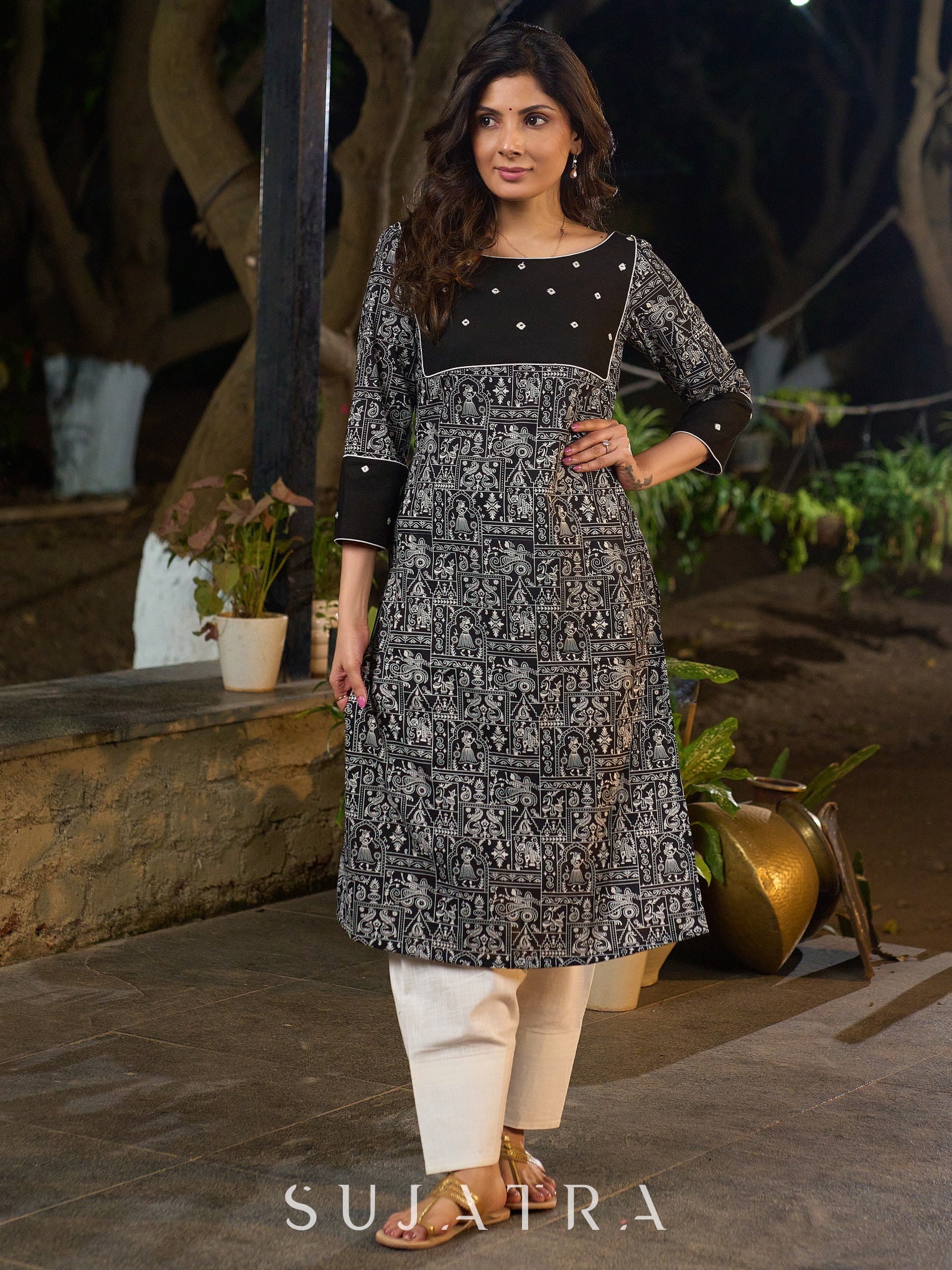 Black Artisanal Printed Kurta with Sparkling Mirror Accents