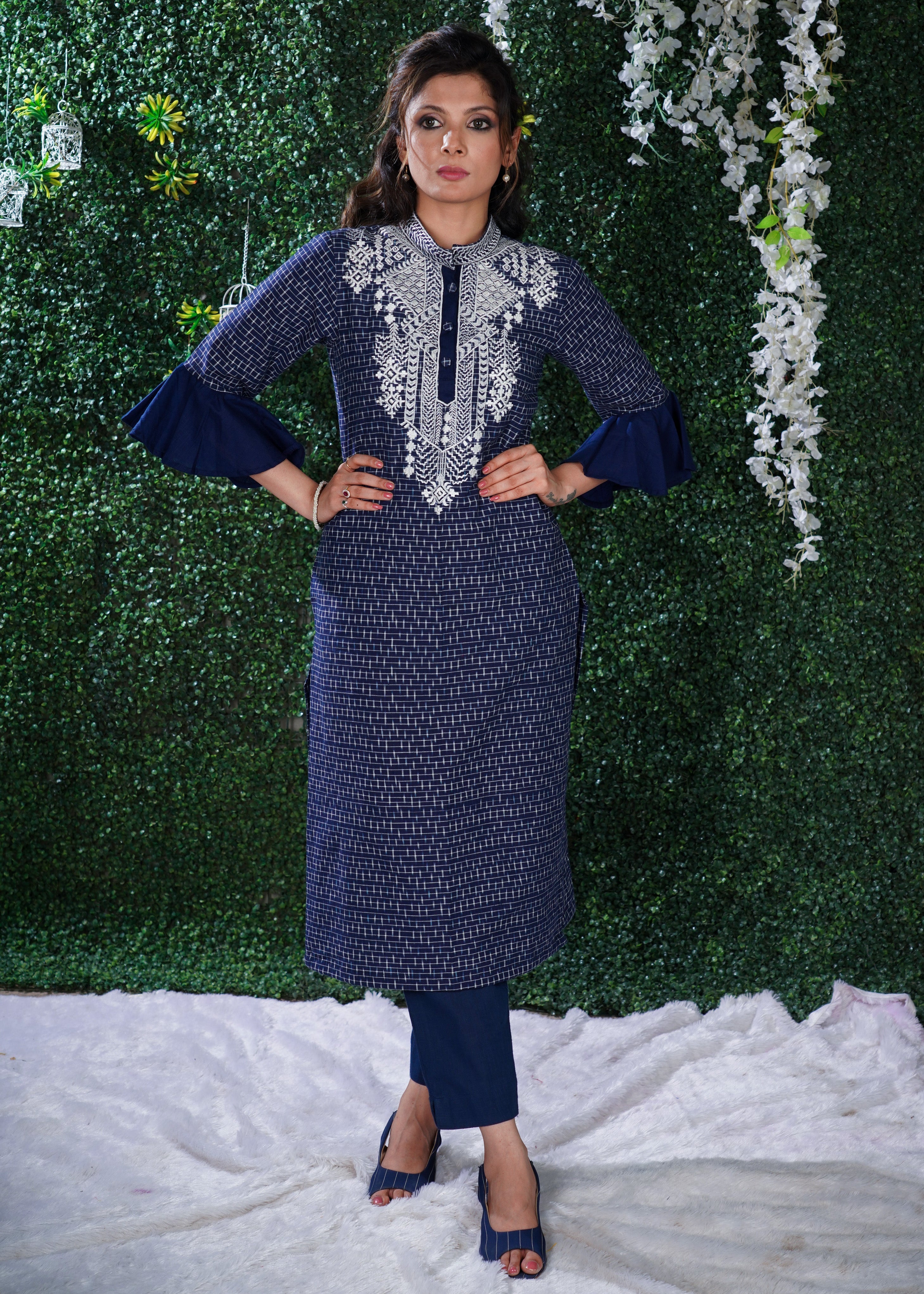 Blue Ikat Cotton Kurta with Elegant Embroidery and matching Chanderi Dupatta - 2 Pc
