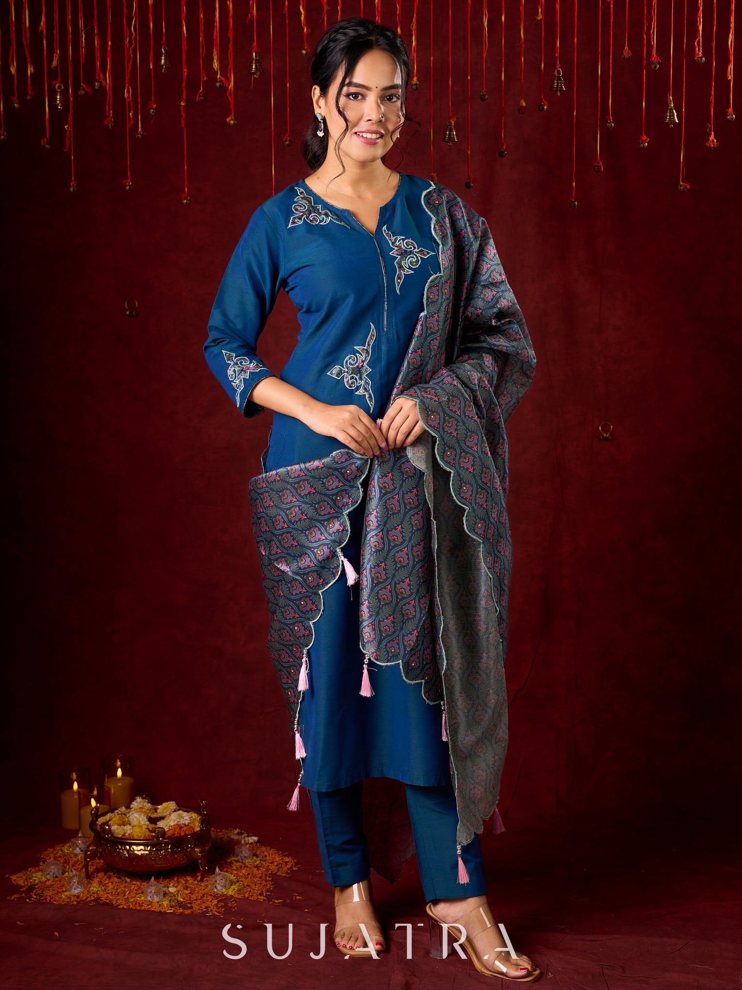 Contemporary peacock Cotton-Silk machine applique kurta - Pant and Dupatta optional