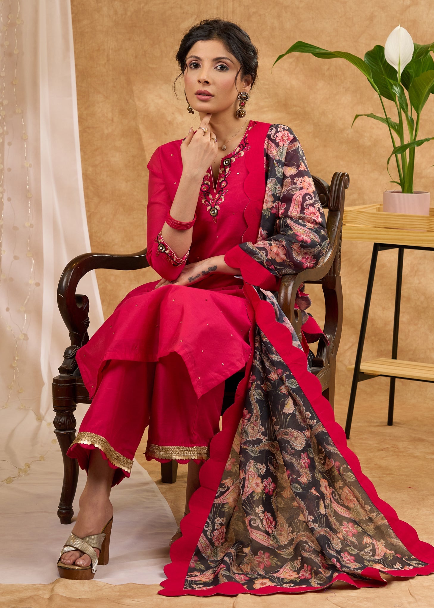 Delicately hand embroidered pink Chanderi kurta