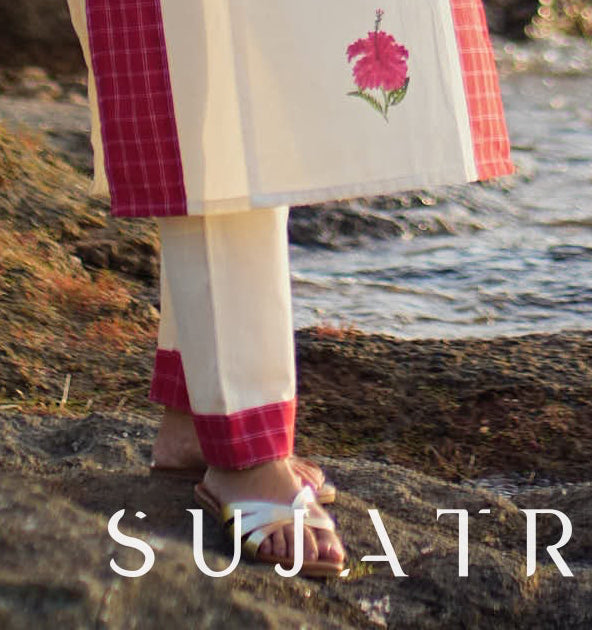 Elegant Off-White Handloom Cotton Kurta with Hibiscus Motifs and Contrast Red Plaid Panels