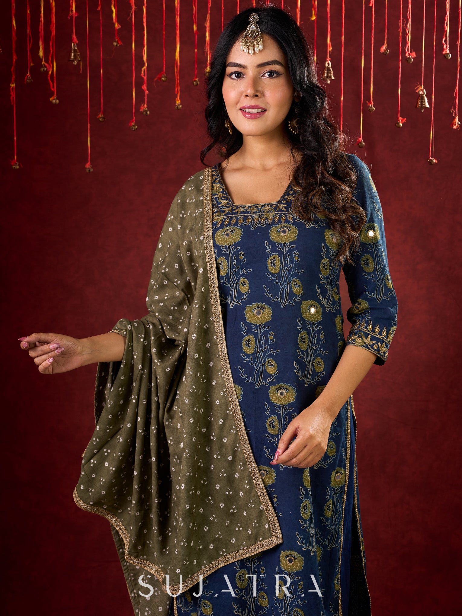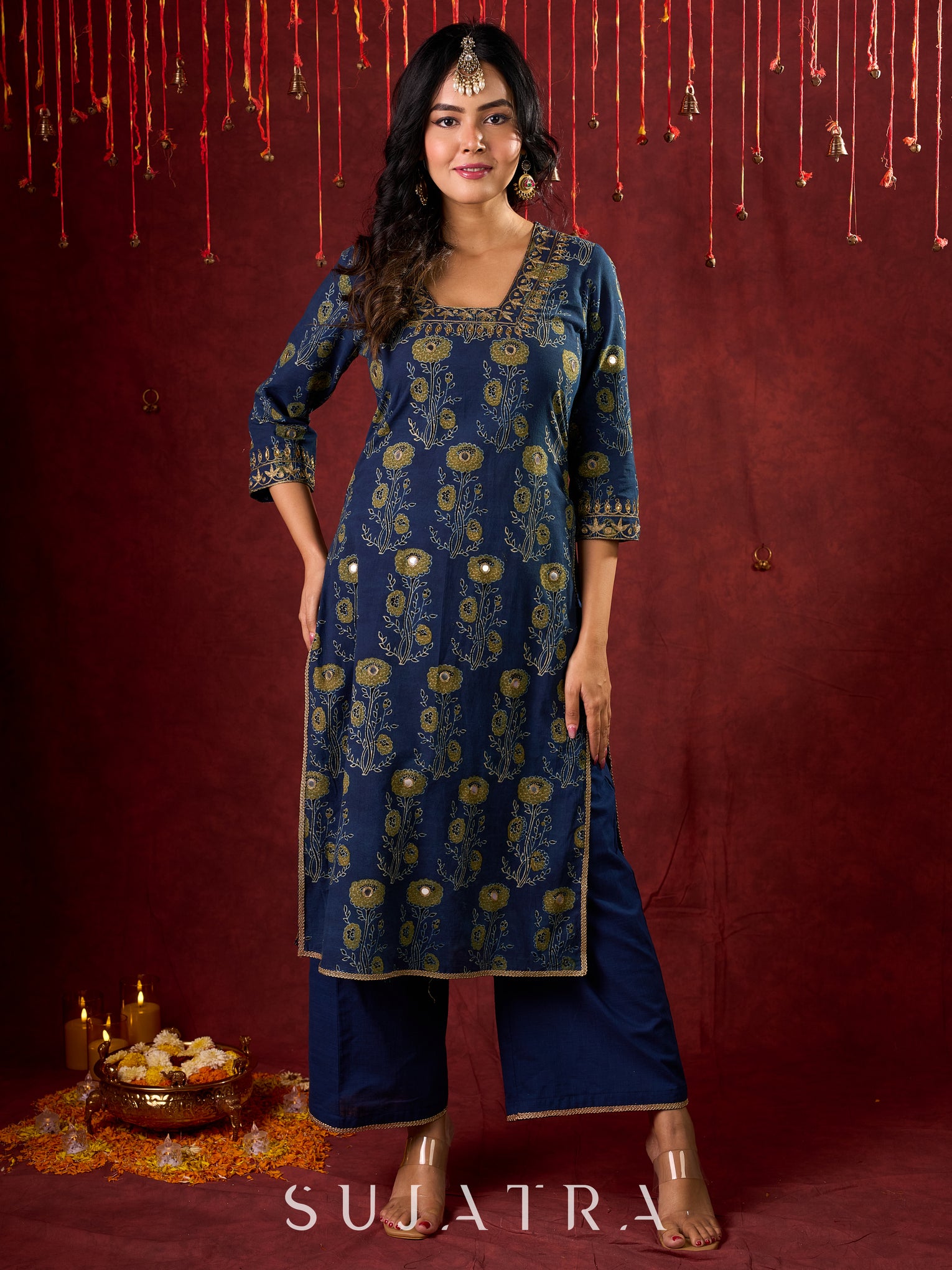 Indigo Ajrakh Kurta with Subtle Embroidered Neckline & Sleeves