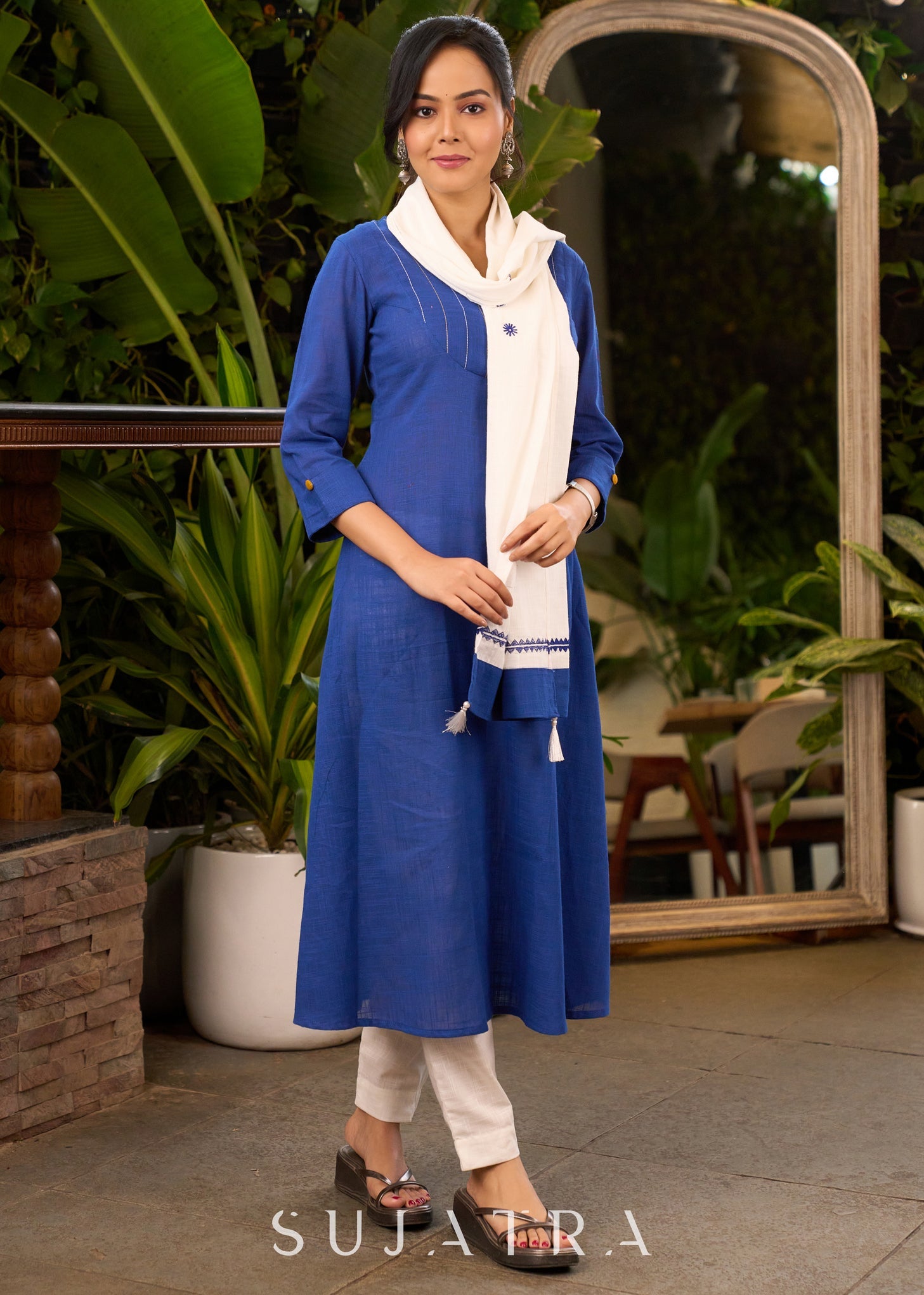 Royal Blue Cotton Kurta with Thread Works on Yoke with Pant - Stole Optional