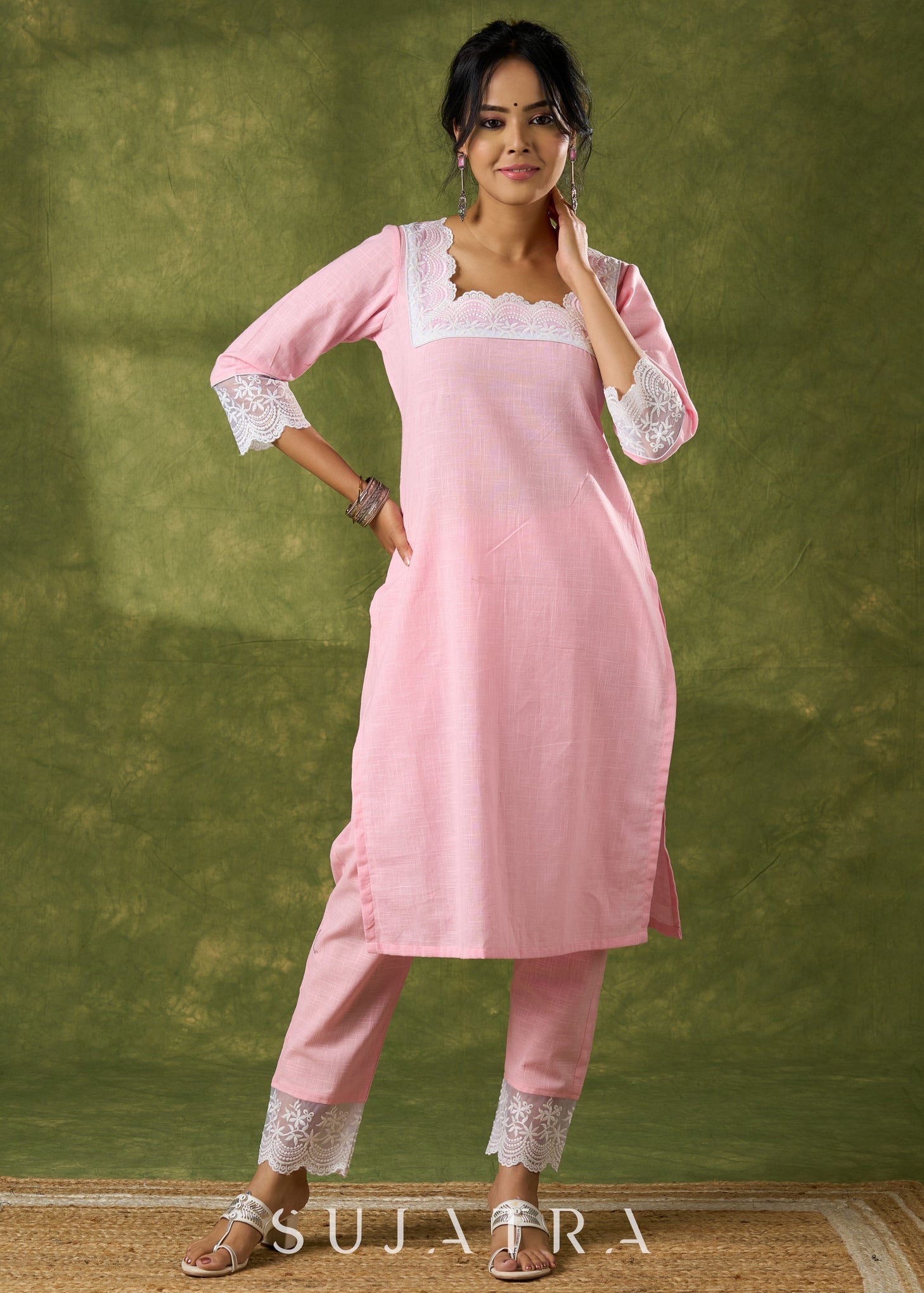 Subtle Baby Pink Cotton Kurta Embellished With Laces - Pant Optional