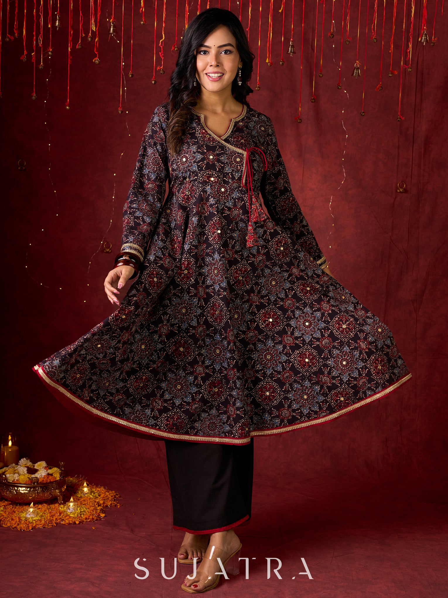 Timeless Black Ajrakh Flared Anarkali with Subtle Artisanal Hand Embroidered Touch
