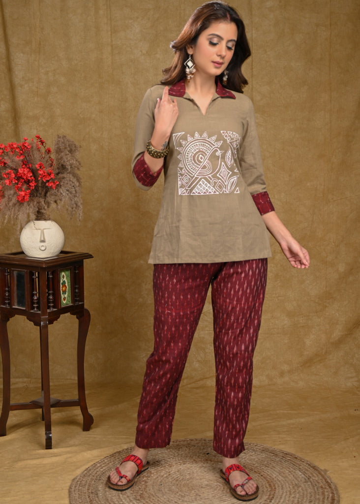 Beige Cotton Top with Exclusive Gond Painting and Maroon Ikaat Collar
