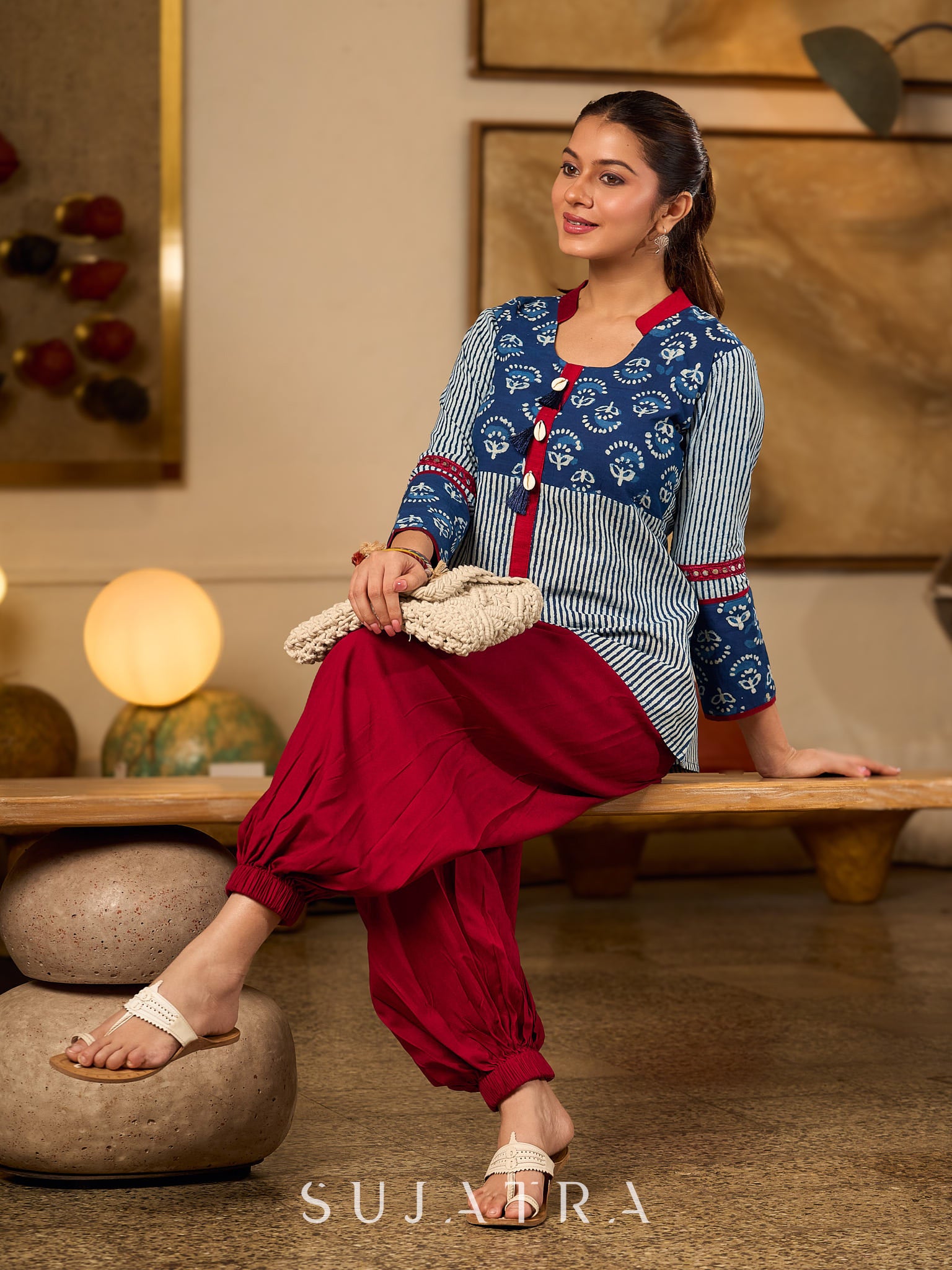 Indigo Cotton Top With Maroon Placket Detailed With Cowrie And Tassels, Finished with Collared Neckline