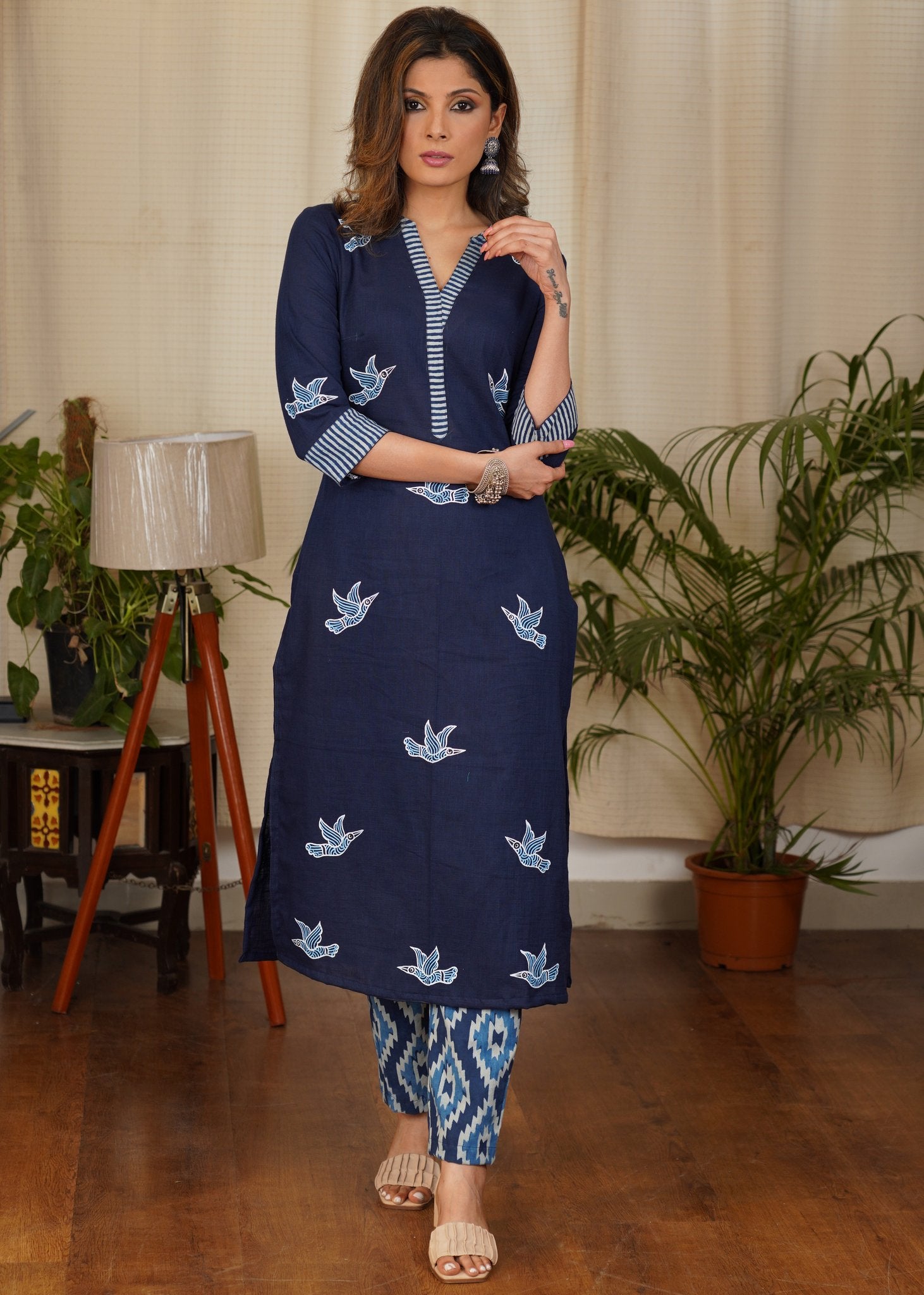 Tasteful Cotton Indigo Combination Kurta With Hand Painted Gond Art Birds Motif