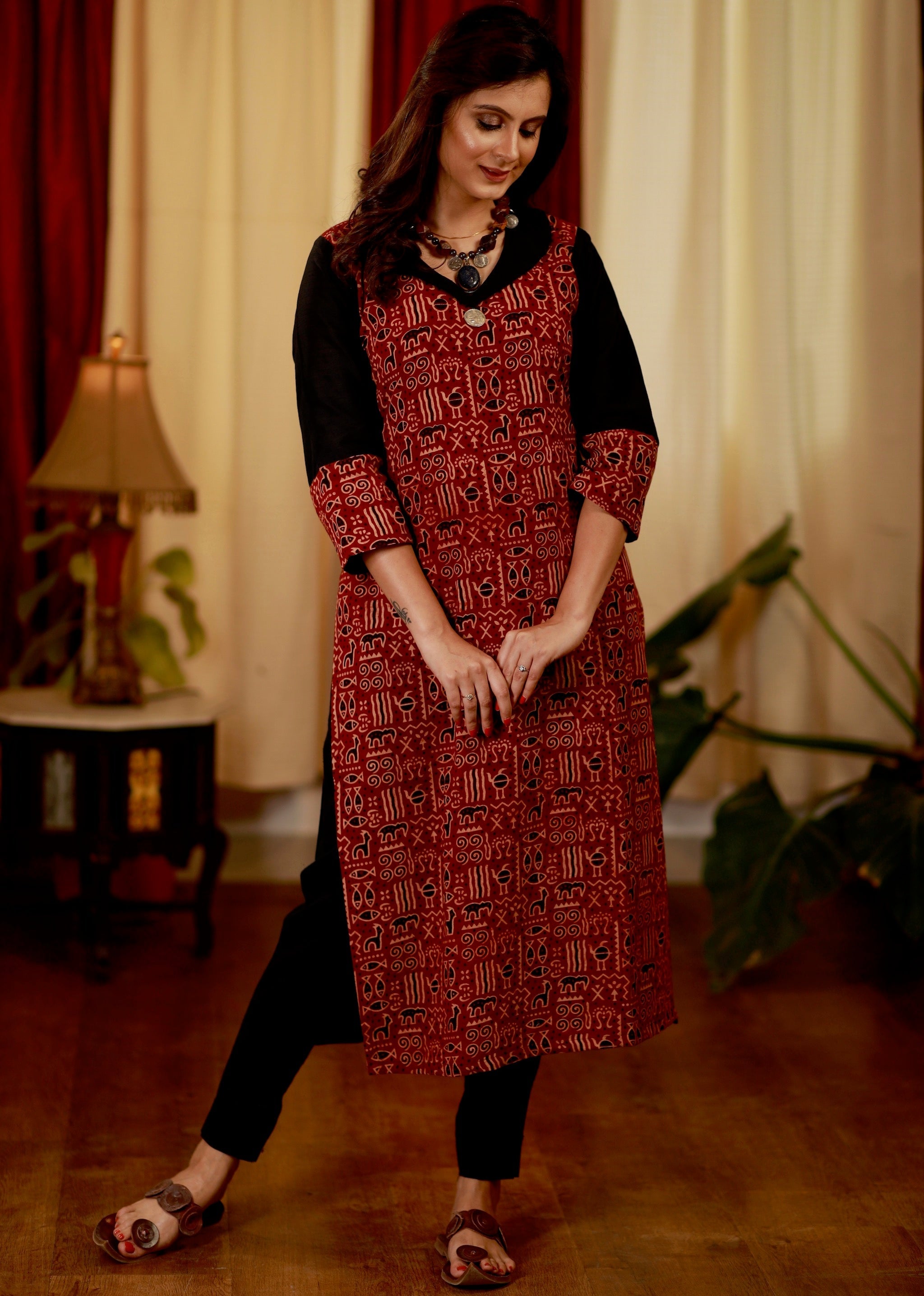 Straight Cut Cotton Ajrakh Kurta with Smart Collars