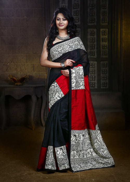 Madhubani printed work on pallu, pleats & Border on Black Chanderi & Red cotton silk