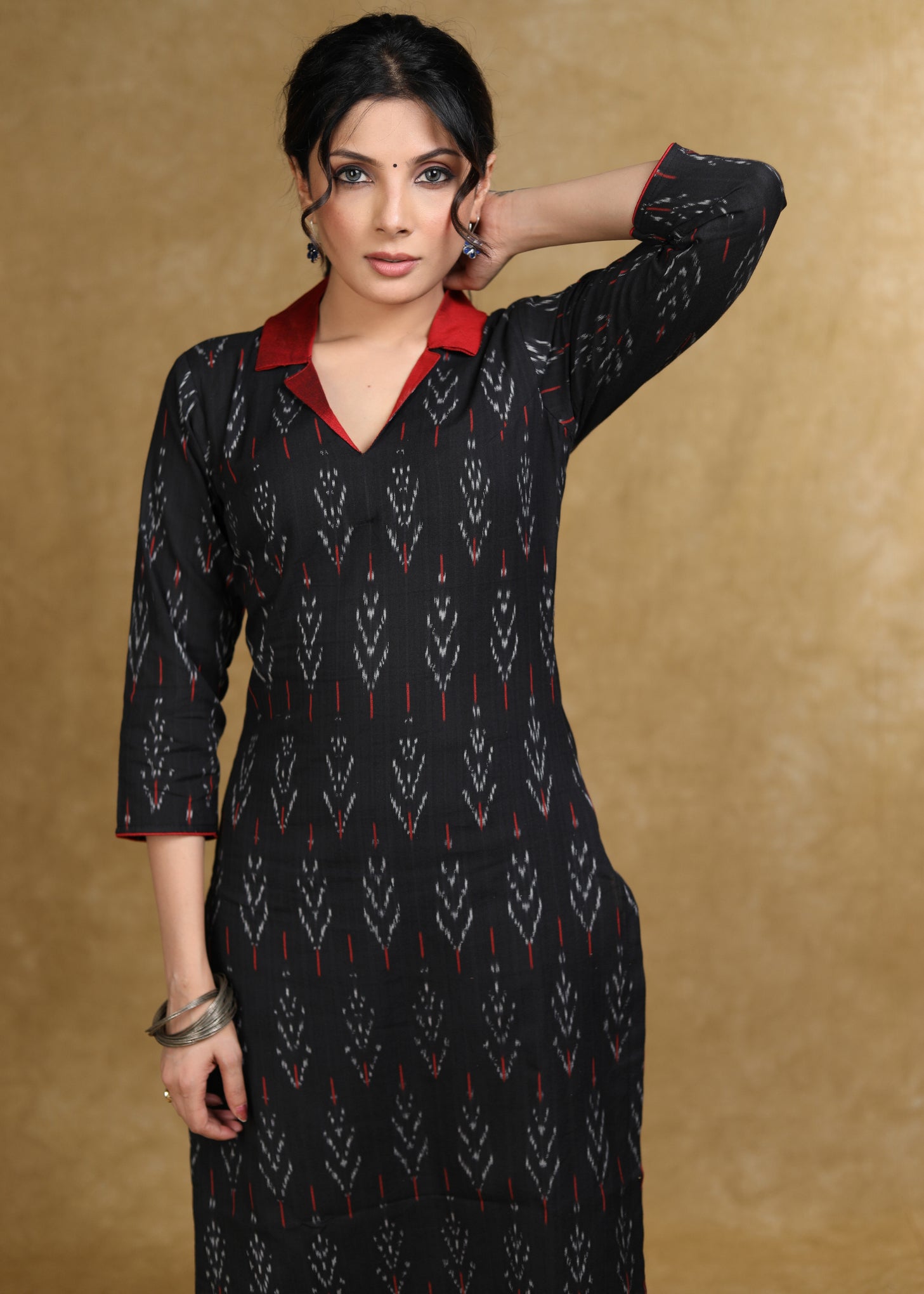 Trendy Black Ikat Kurta with Contrast Collar - Coord Pant Optional