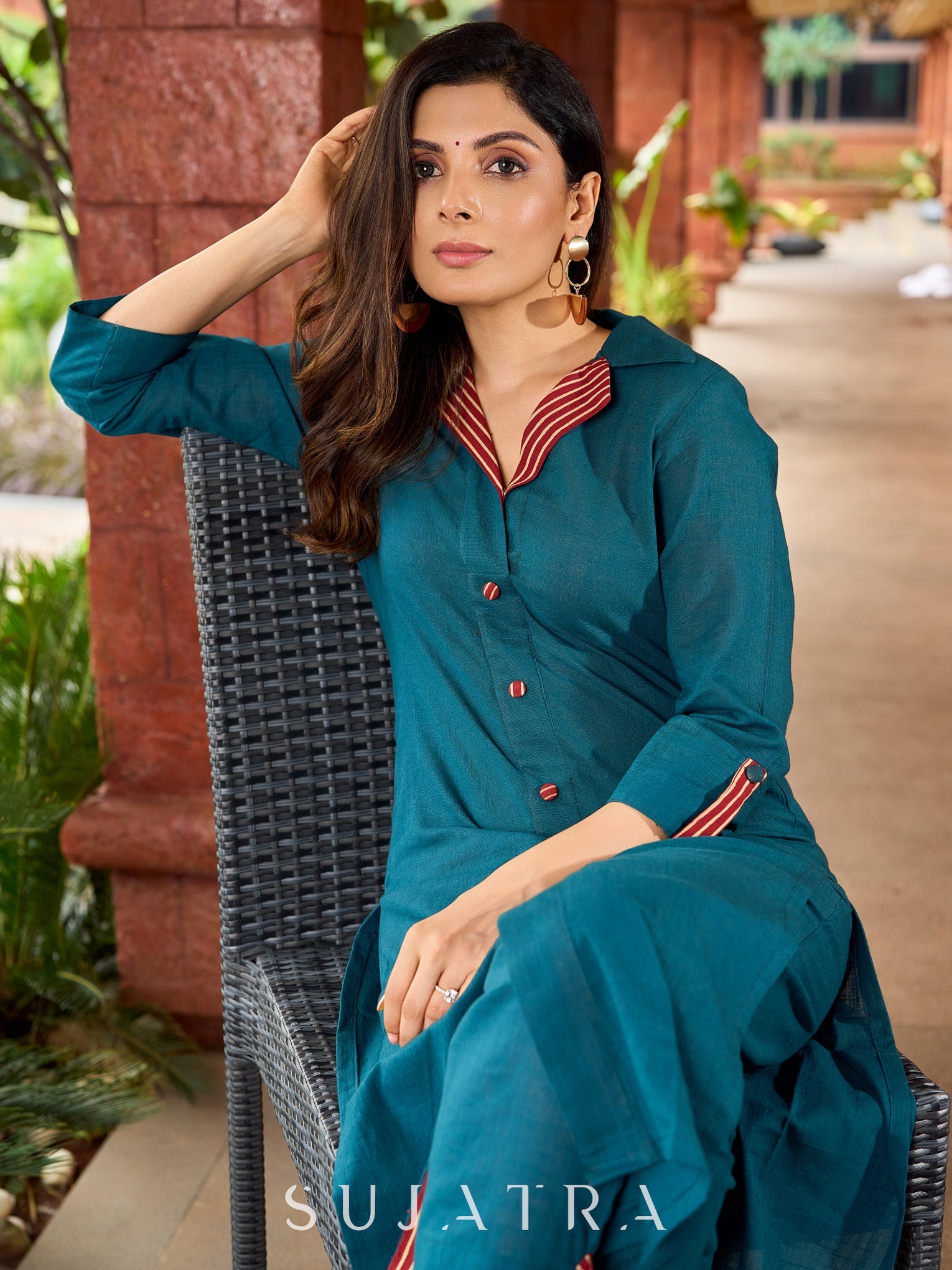 Kalamkari-accented teal cotton kurta with a beautifully balanced combination - teal pant optional