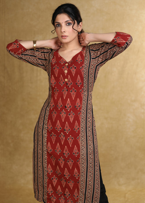 Elegant V Neckline Cotton Ajrakh Combination Straight Cut Kurta with Wooden Buttons - Pant Optional