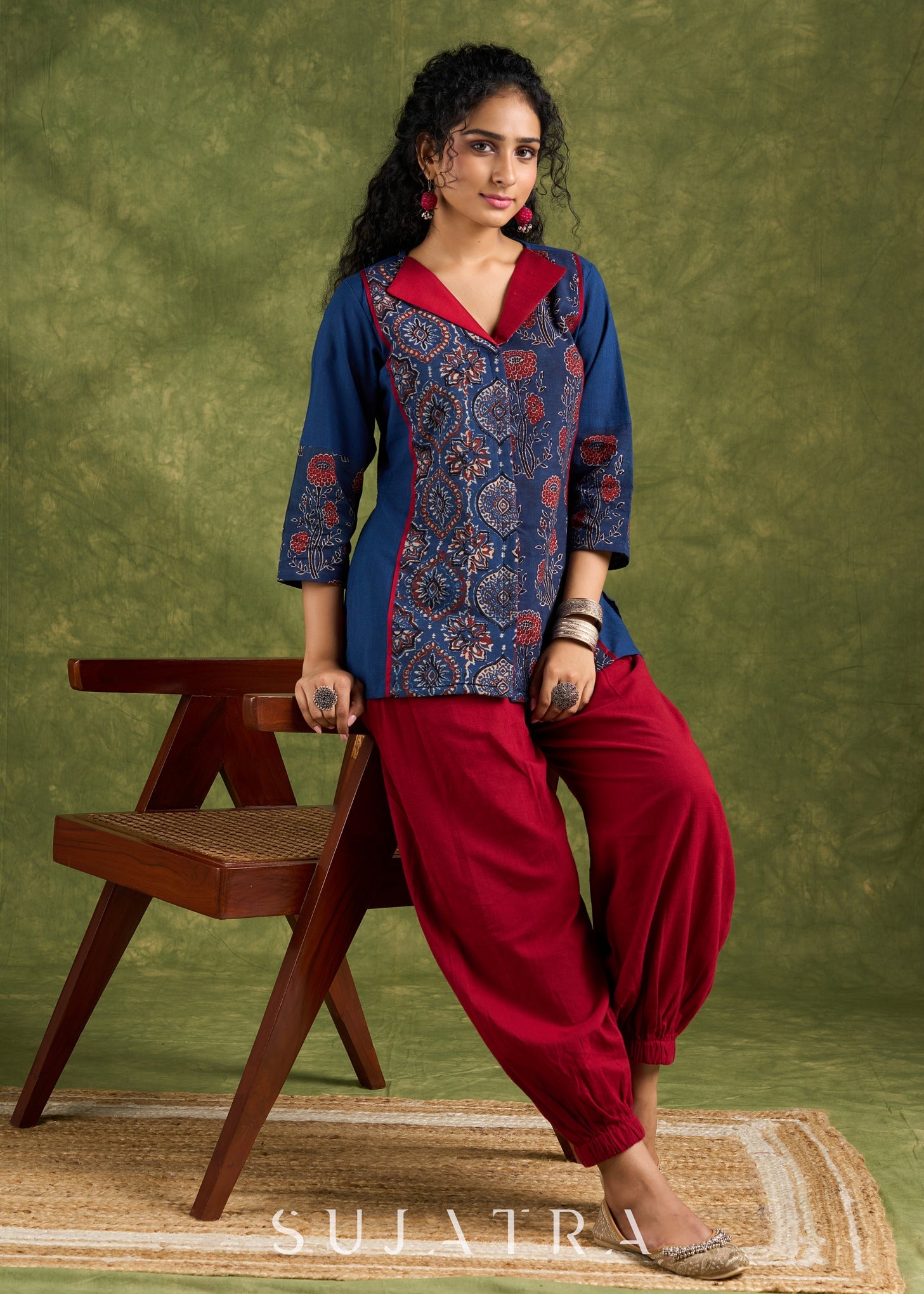 Elegant Navy Blue Ajrak Combination Top - Pant Optional