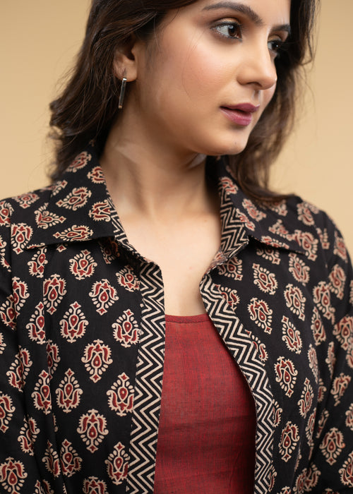 Smart Black Ajrakh Jacket with Cotton Silk Inner (2 Piece) - Ajrakh Pant Optional