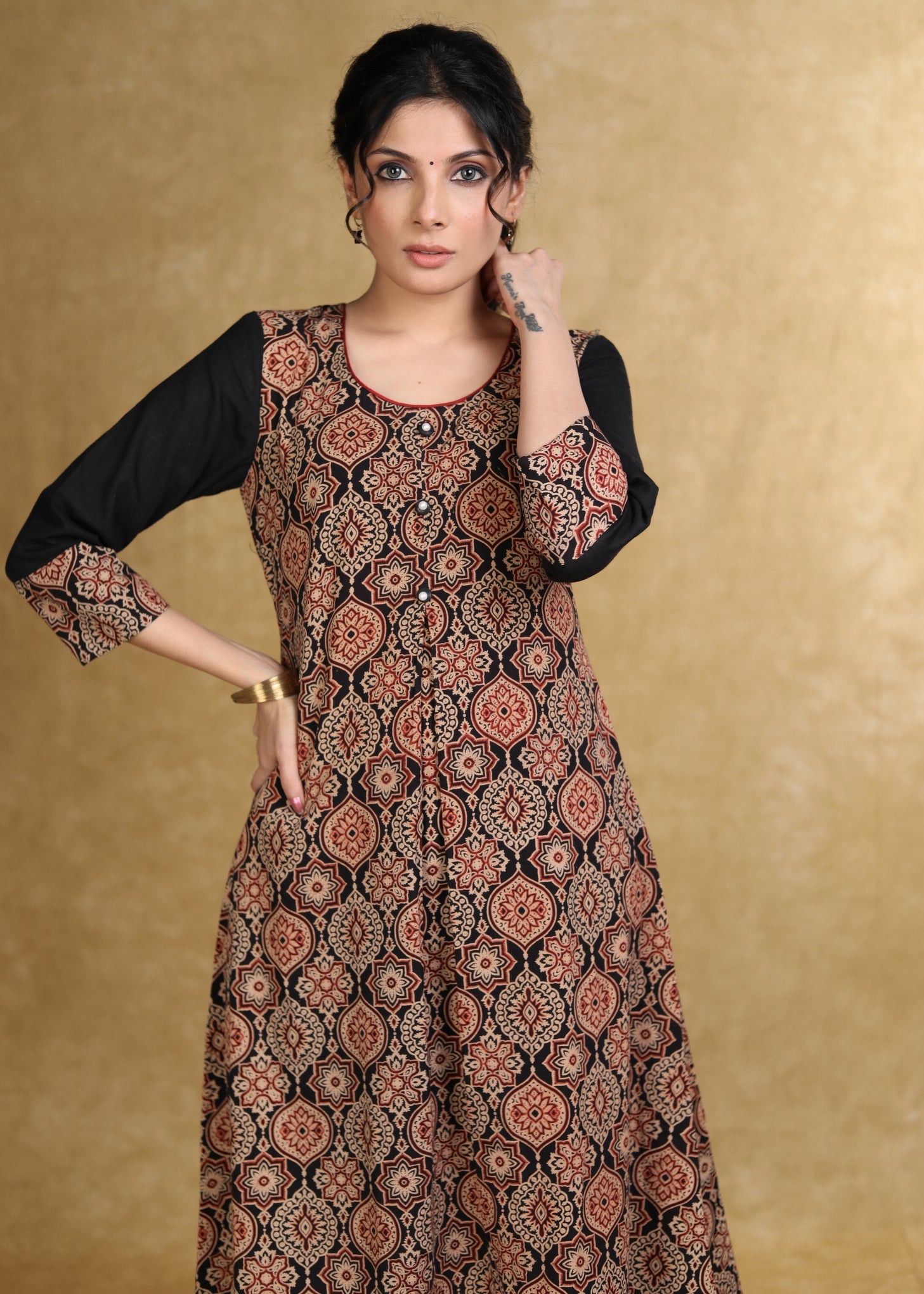 Classy Black Cotton Ajrakh Box Pleated Kurta