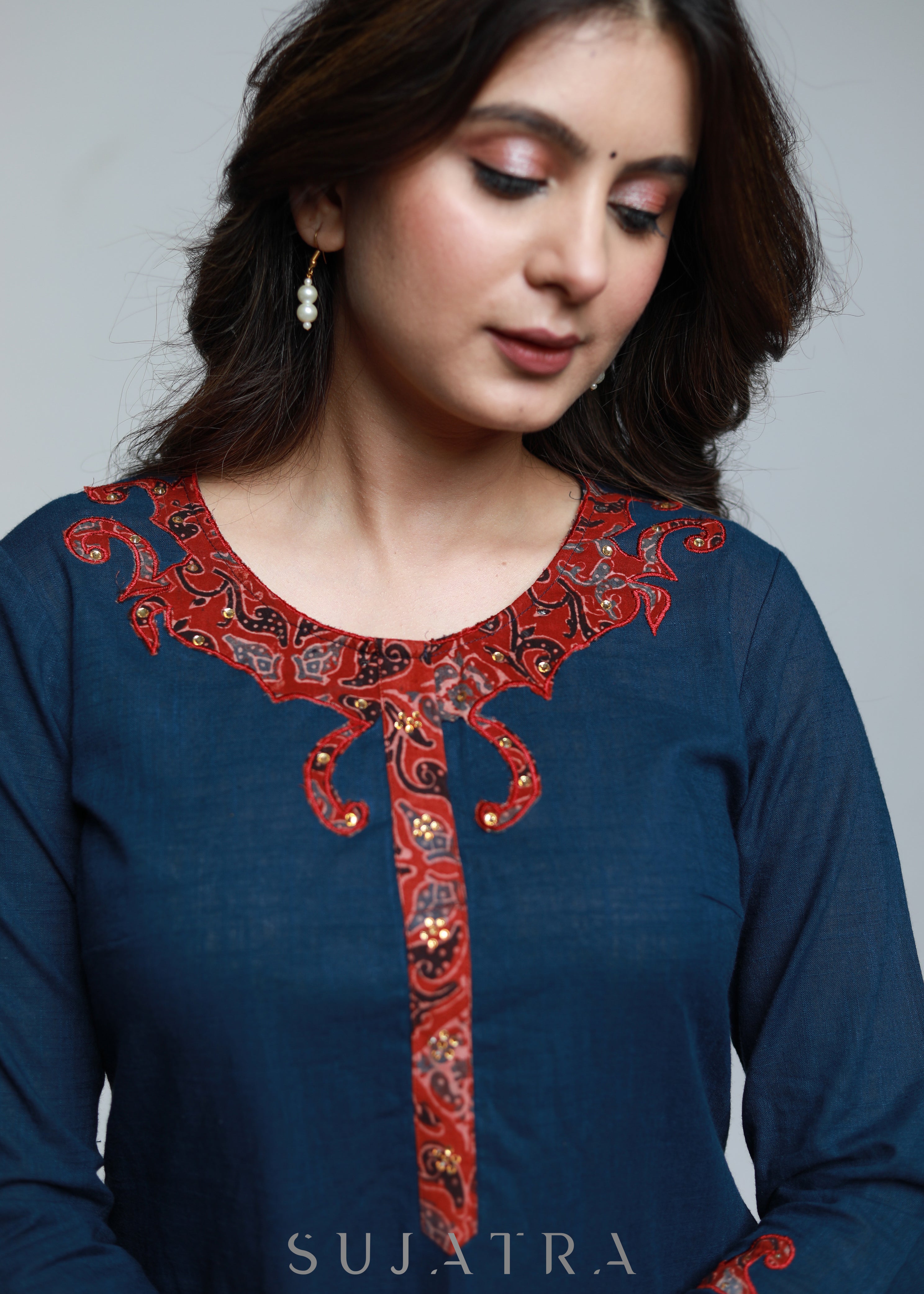 Navy Blue Cotton Ajrak Kurta with Applique Work-Pant Optional