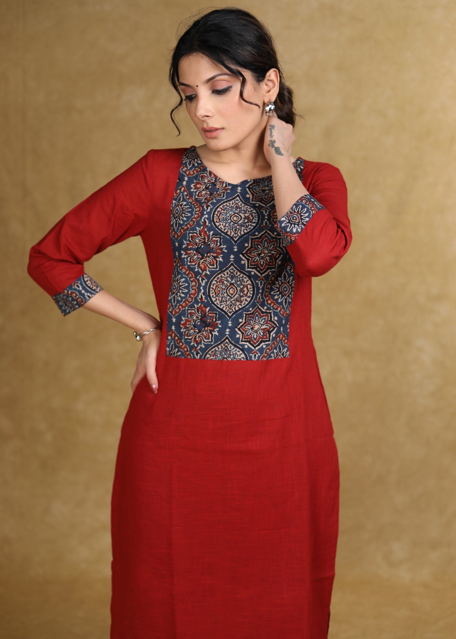 Smart Maroon Cotton Kurta with Blue Ajrakh Yoke
