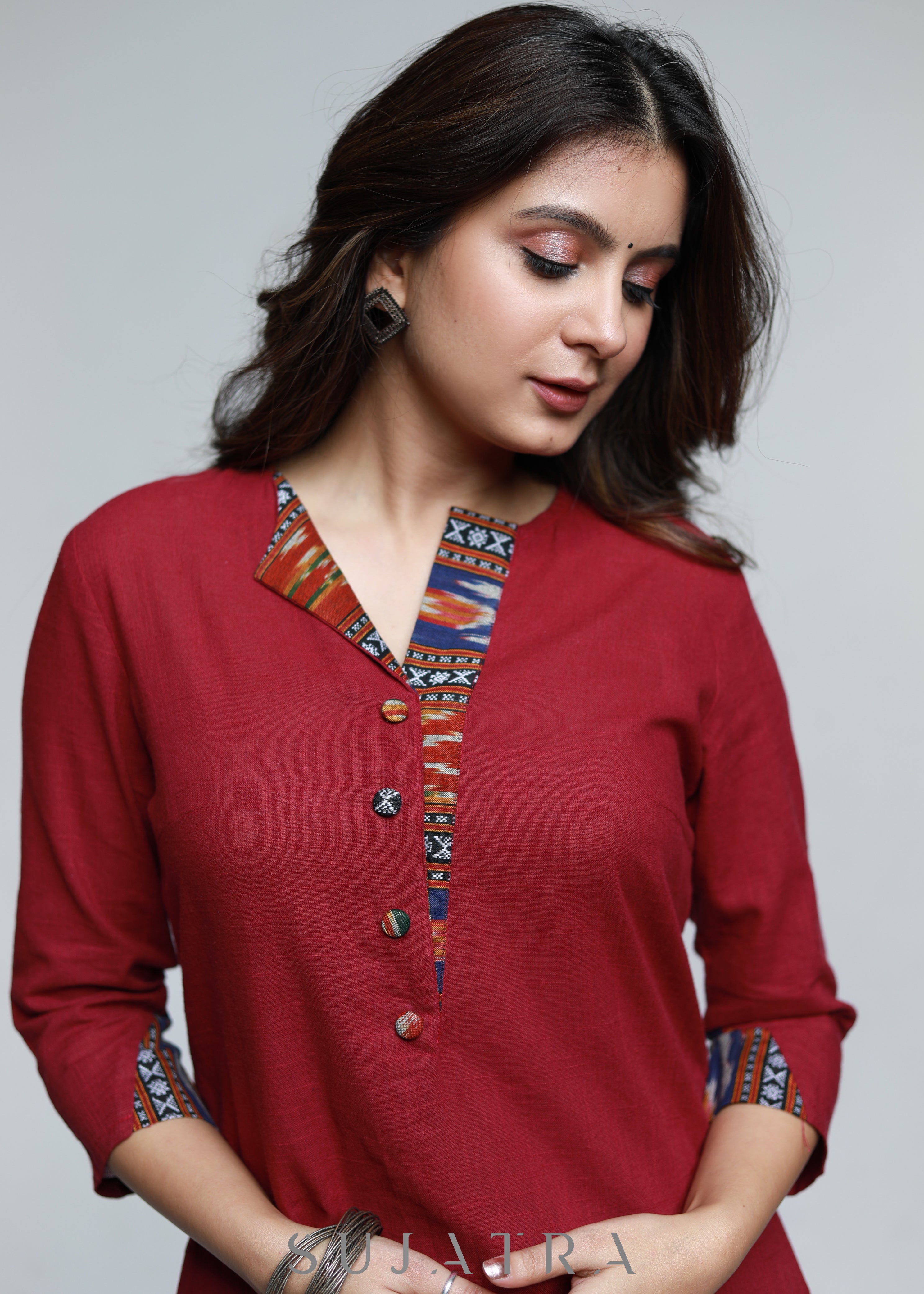 Maroon Cotton Ikat Straight Kurta-Pant Optional