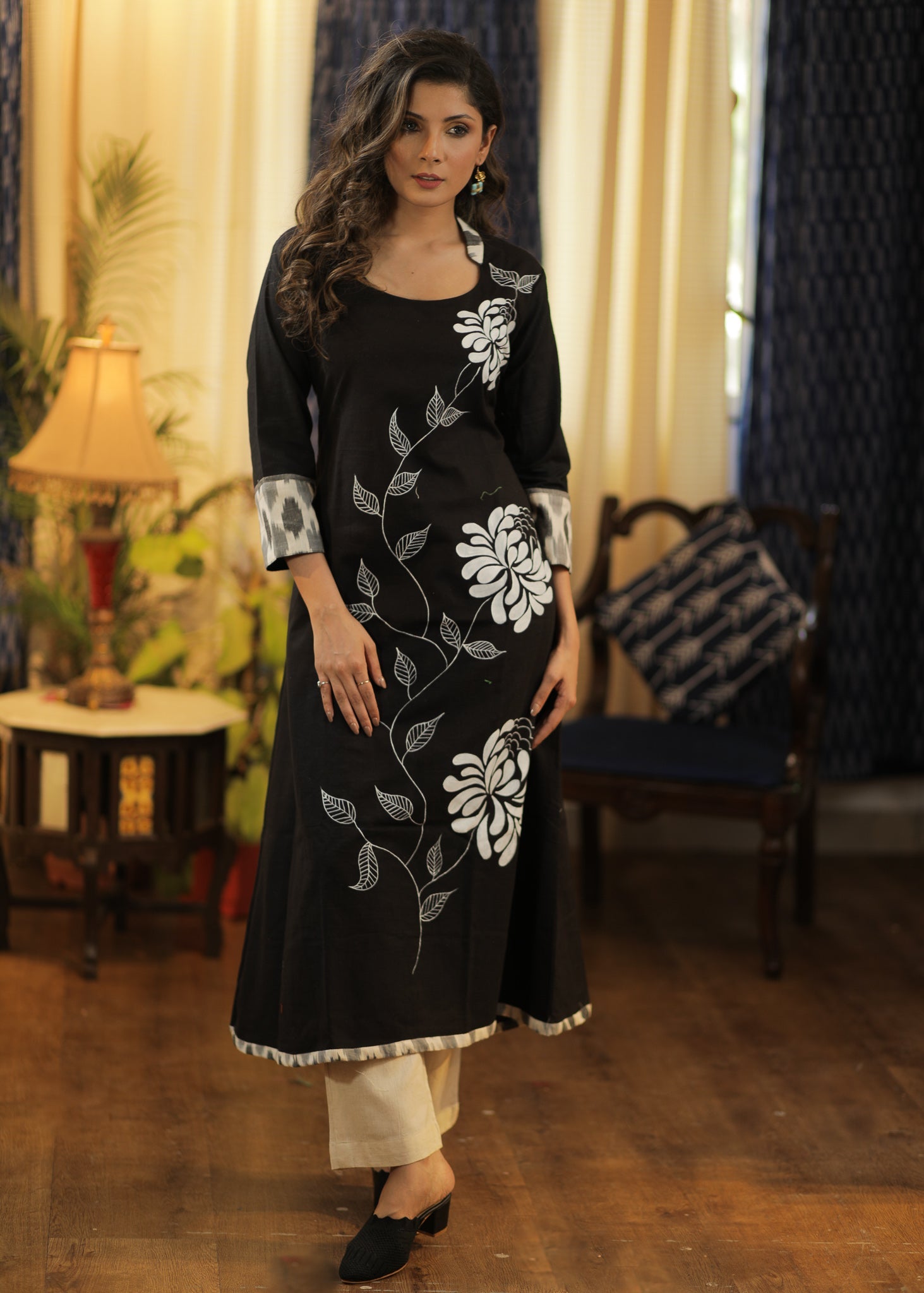 A-line Handloom Cotton Kurta with Ikat and Exclusive Hand Painting all over