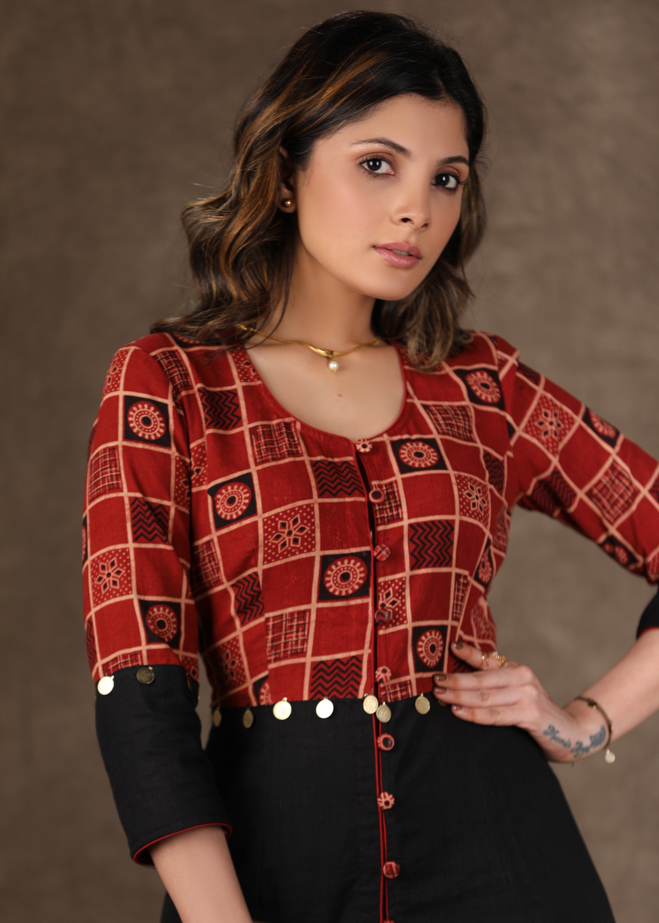 Exclusive Cotton Ajrakh Combination Kurta with Centre Slit and Gold Coin Work