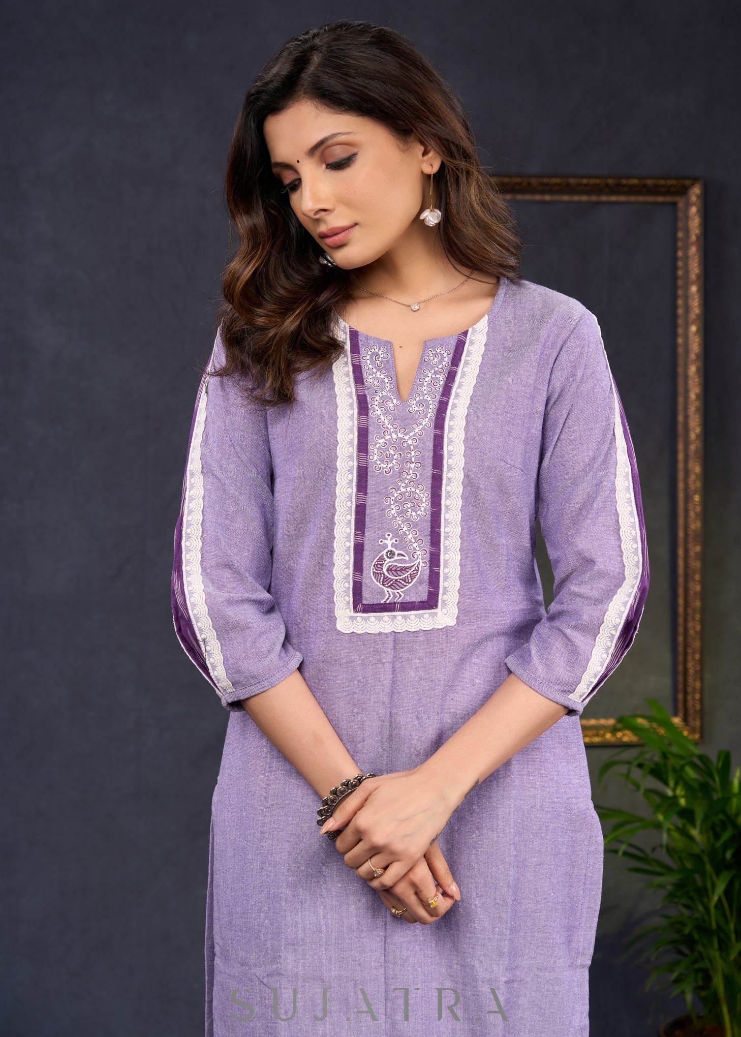 Exclusive-Lilac-Cotton-Straight-Cut-Kurta-Highlighted-With-Ikat-Puff-Sleeves-And-Beautiful-Painting-On-The-Yoke--Pant-Optional