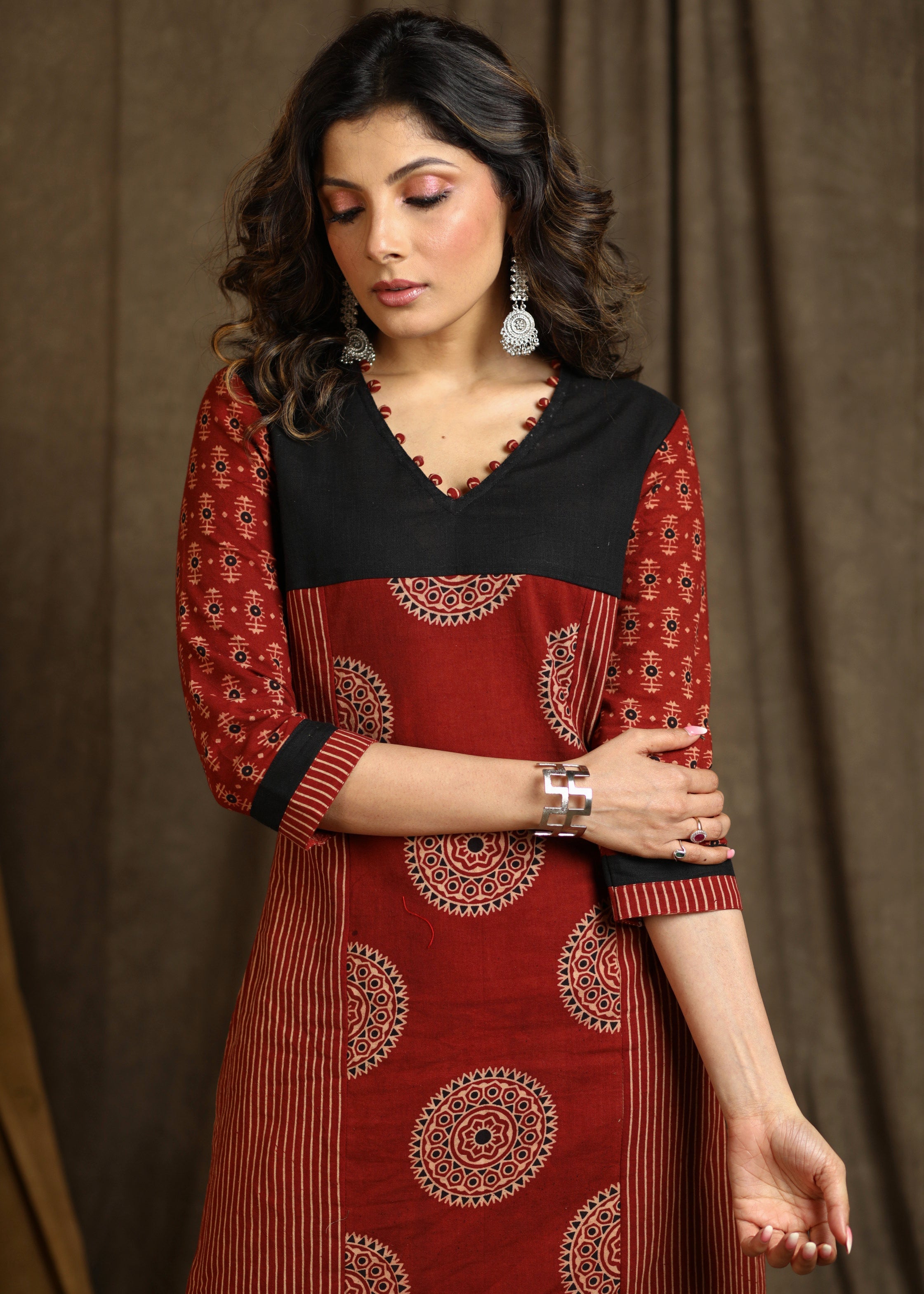 Smart Straight Cut Cotton Ajrakh Combination Kurta - Pant Optional