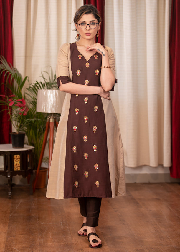 A-Line Beige Colour cotton silk Kurta with Beautiful full length Handmade Zardosi work