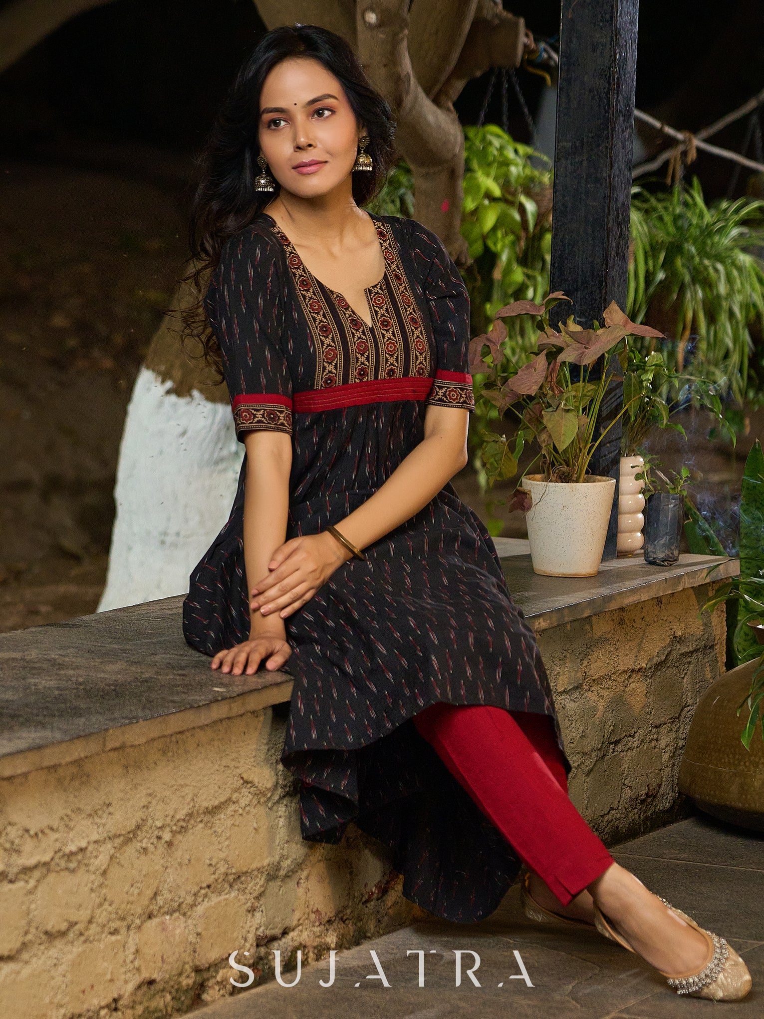 Black Ikat Weave Kurta Featuring Artisan Ajrakh Yoke