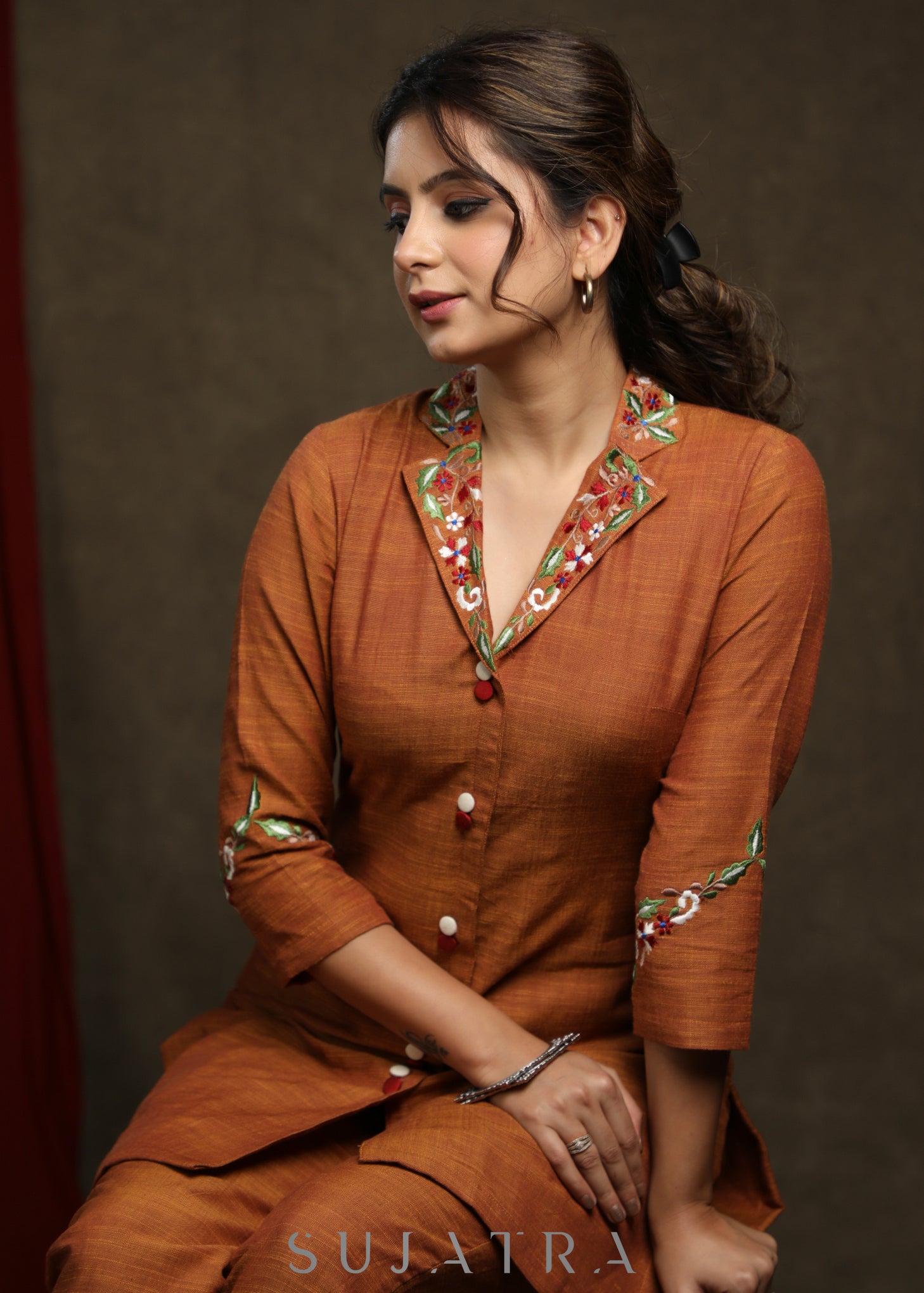 Trendy Rust cotton tunic with embroidered collar & sleeves - Co ord pant optional