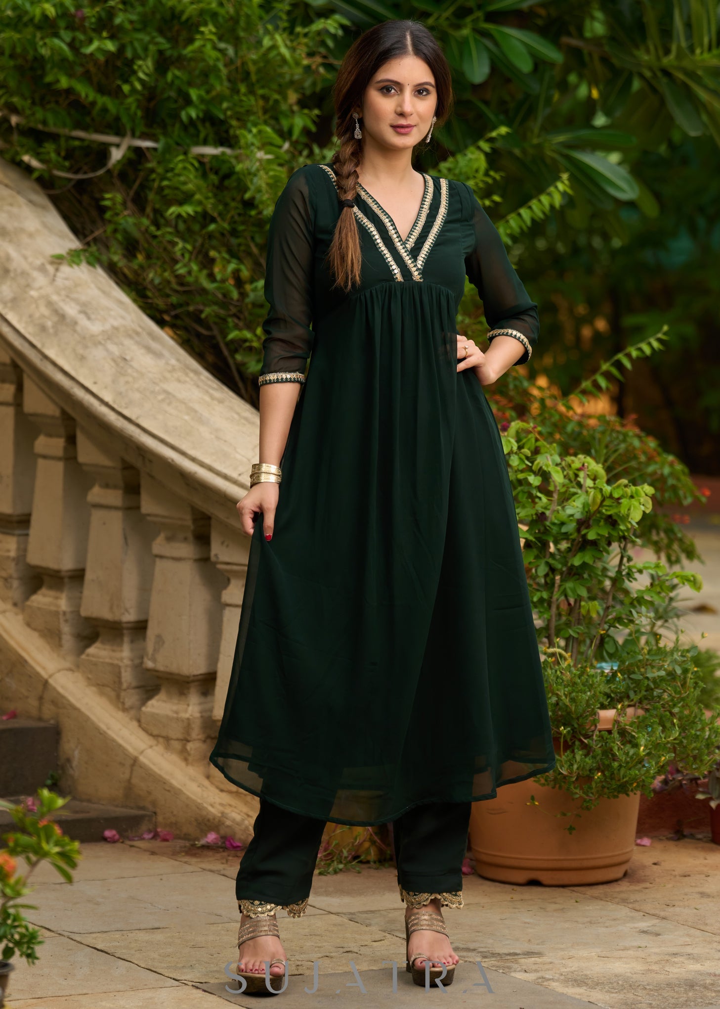 Elegance redefined in this captivating green georgette lace kurta and pant ensemble