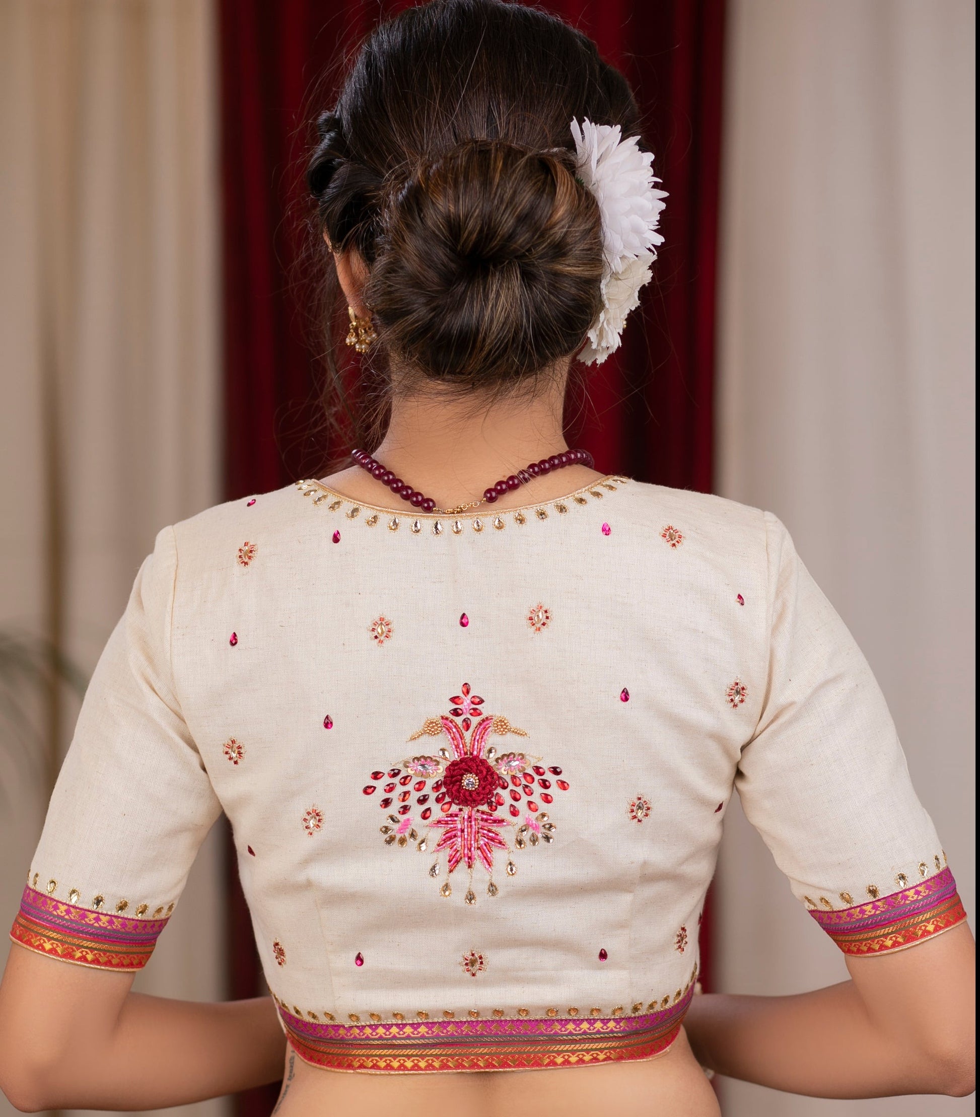 Elegant ivory cotton blouse with overall hand embroidered madhubani motif