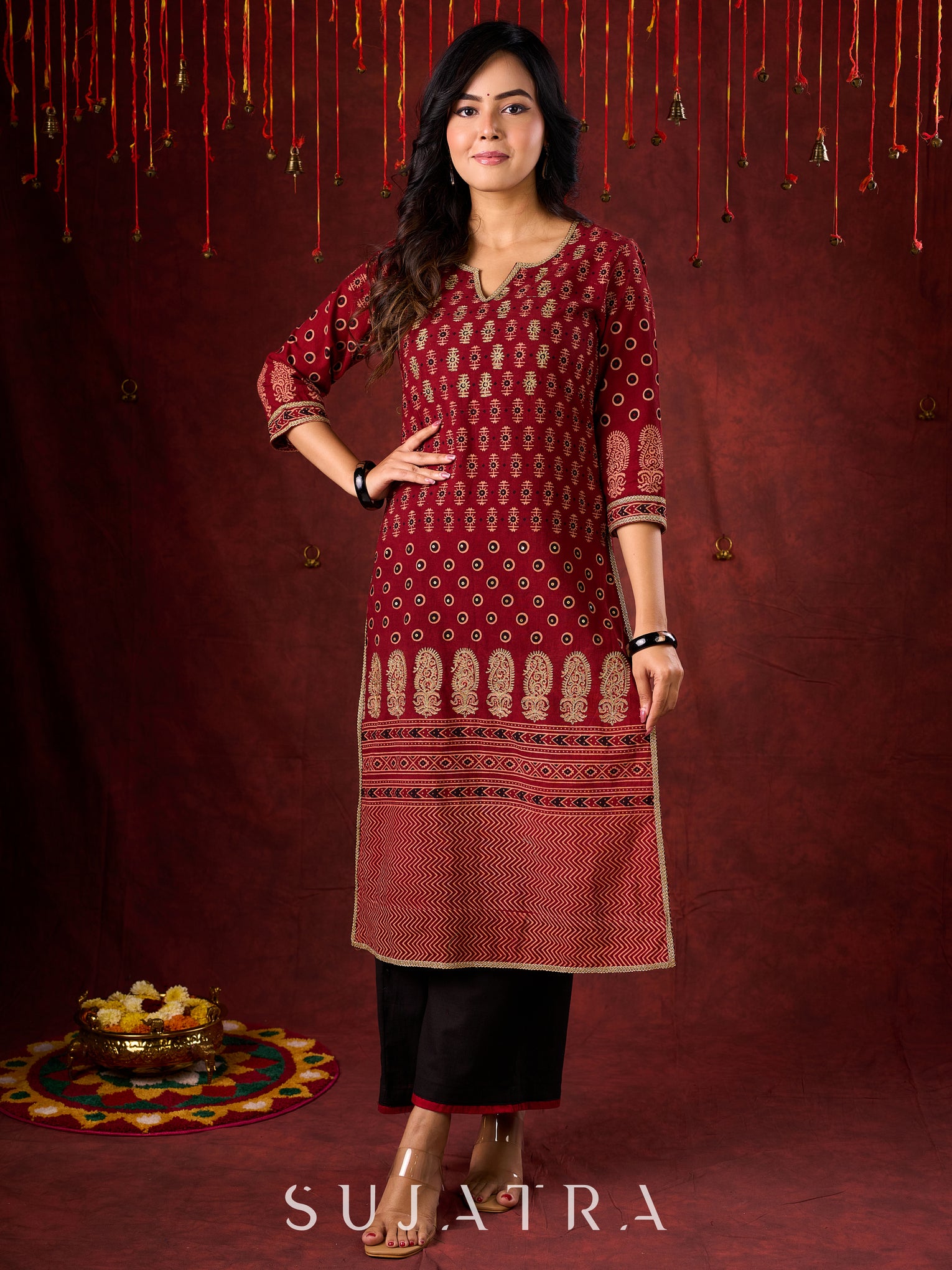 Classic Maroon Ajrakh Cotton Kurta with Minimalist Embroidery