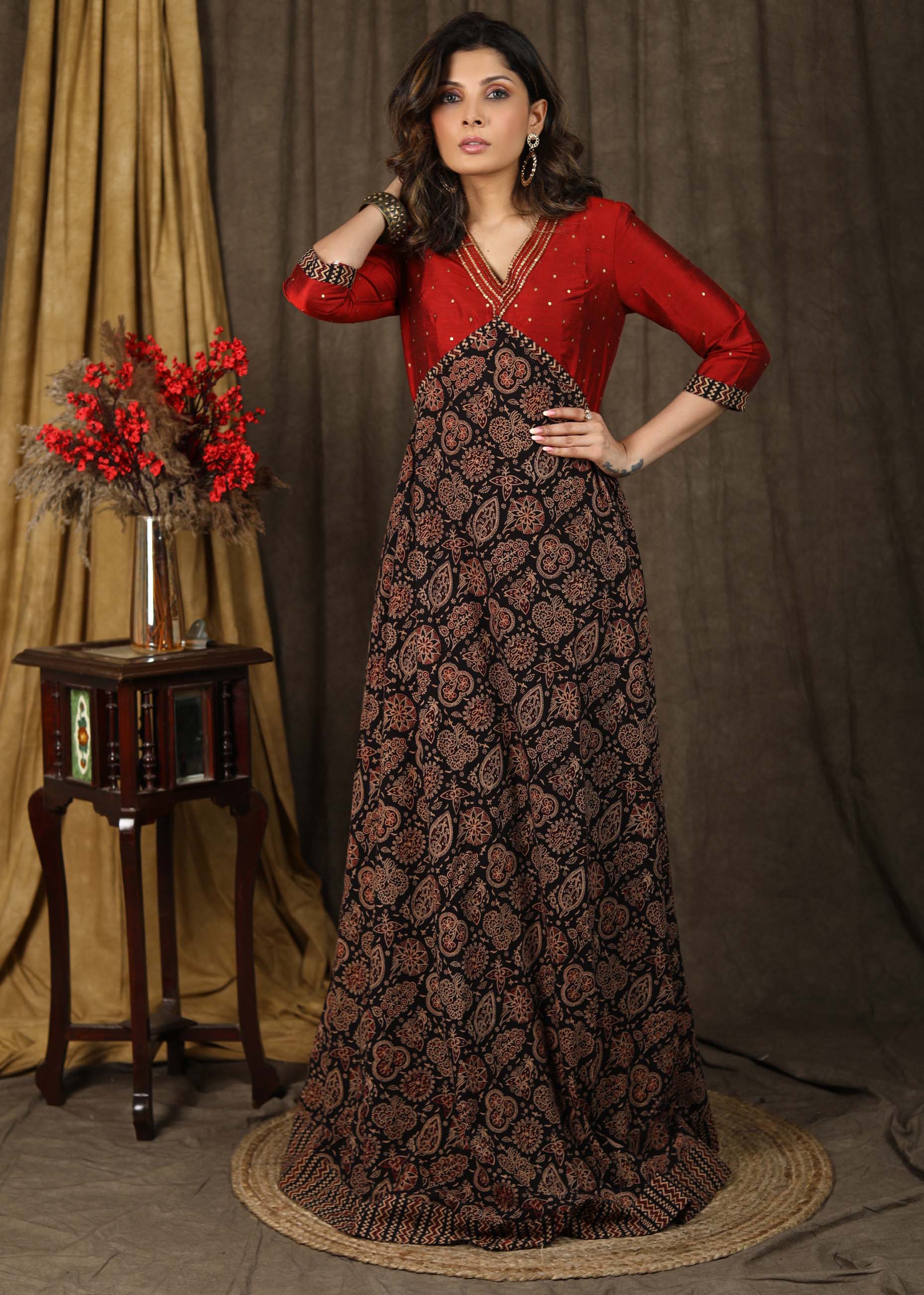 Classy ajrakh combination Kalidaar gown highlighted with hand embroidery on neck and sleeves