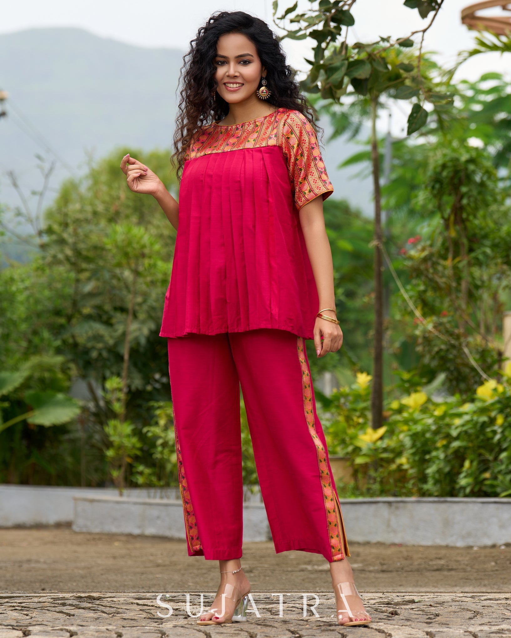 Blush Brocade Pleated Cotton-Silk Top with Additional Slit Pants