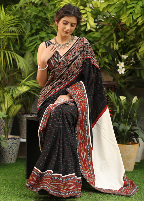 Elegant Ikat & Ajrakh fusion cotton saree