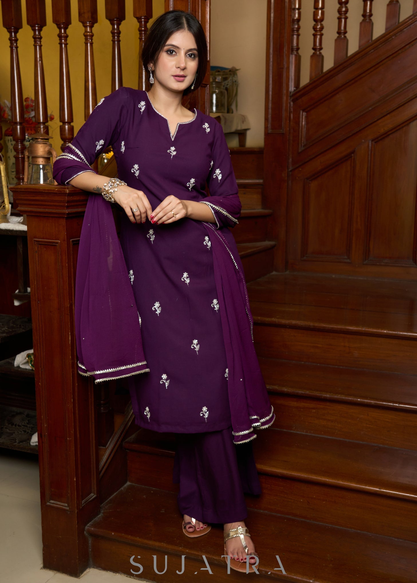 Exquisite hand-embroidered purple rayon kurta with matching pants - Dupatta Optional