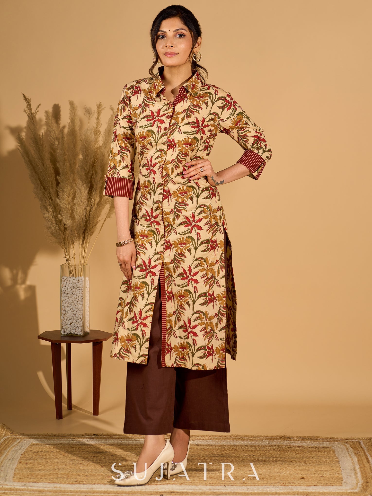 Blissful Beige Mul Cotton Floral Printed Kurta with Contrast Ajrakh Accents