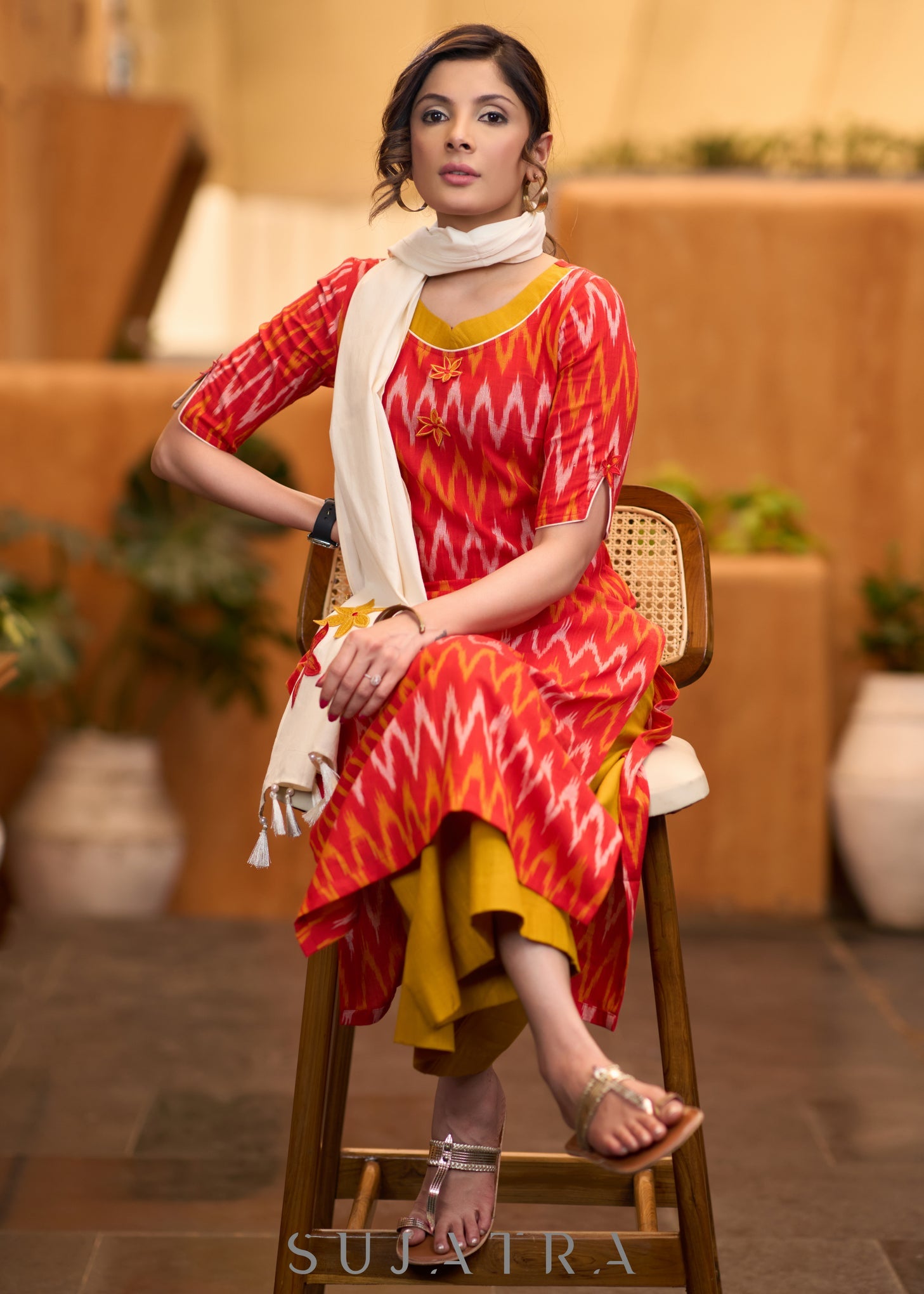 Elegant orange ikat kurta with patchwork buttons & palazzo Stole optional