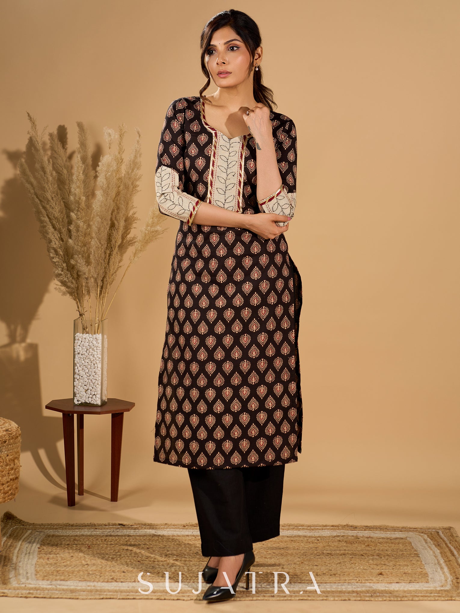 Artisan Noir Kurta Set with Intricate Appliqué & Kantha Work Silk Dupatta