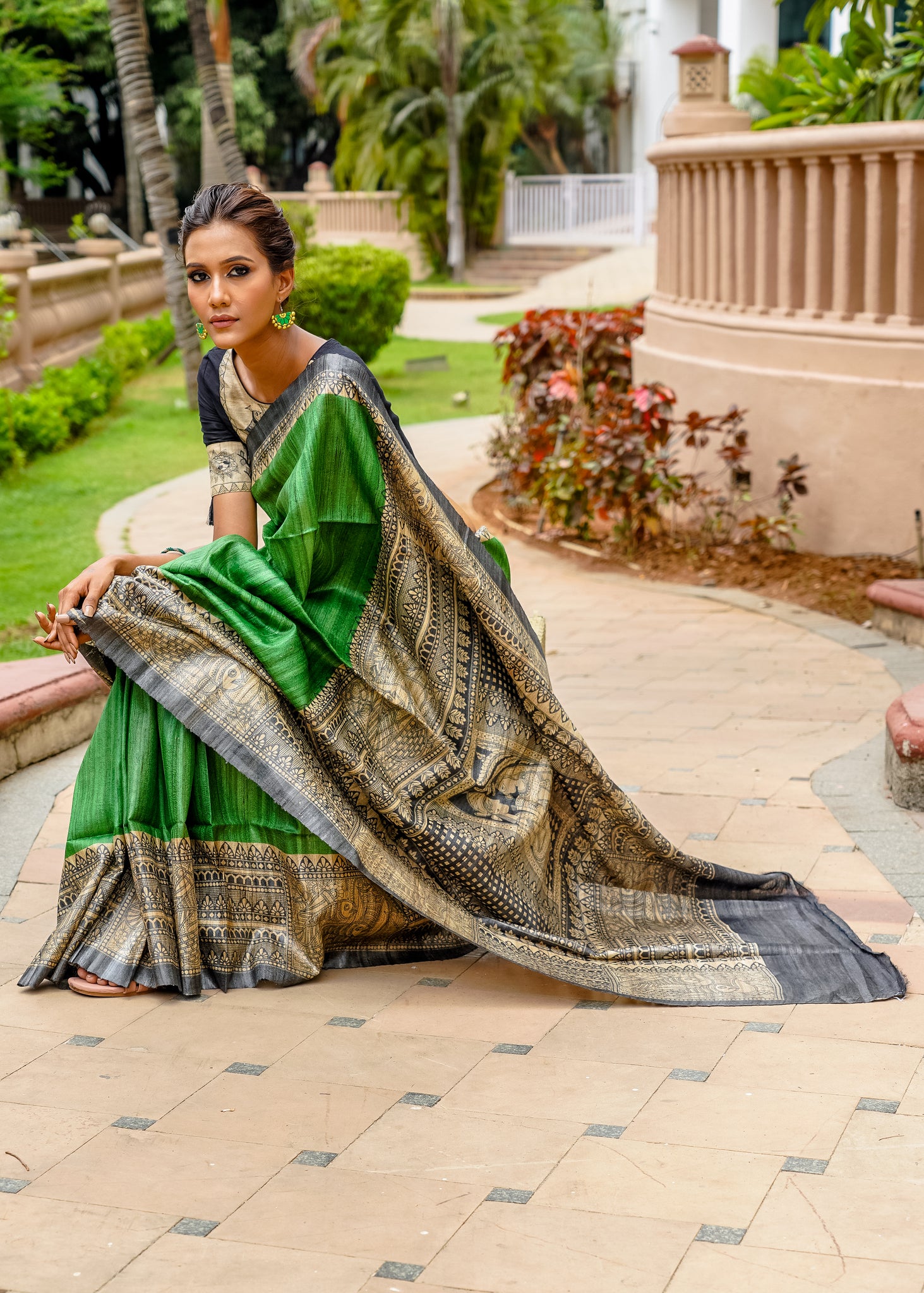 Beautiful green pure Ghicha silk handpainted madhubani saree
