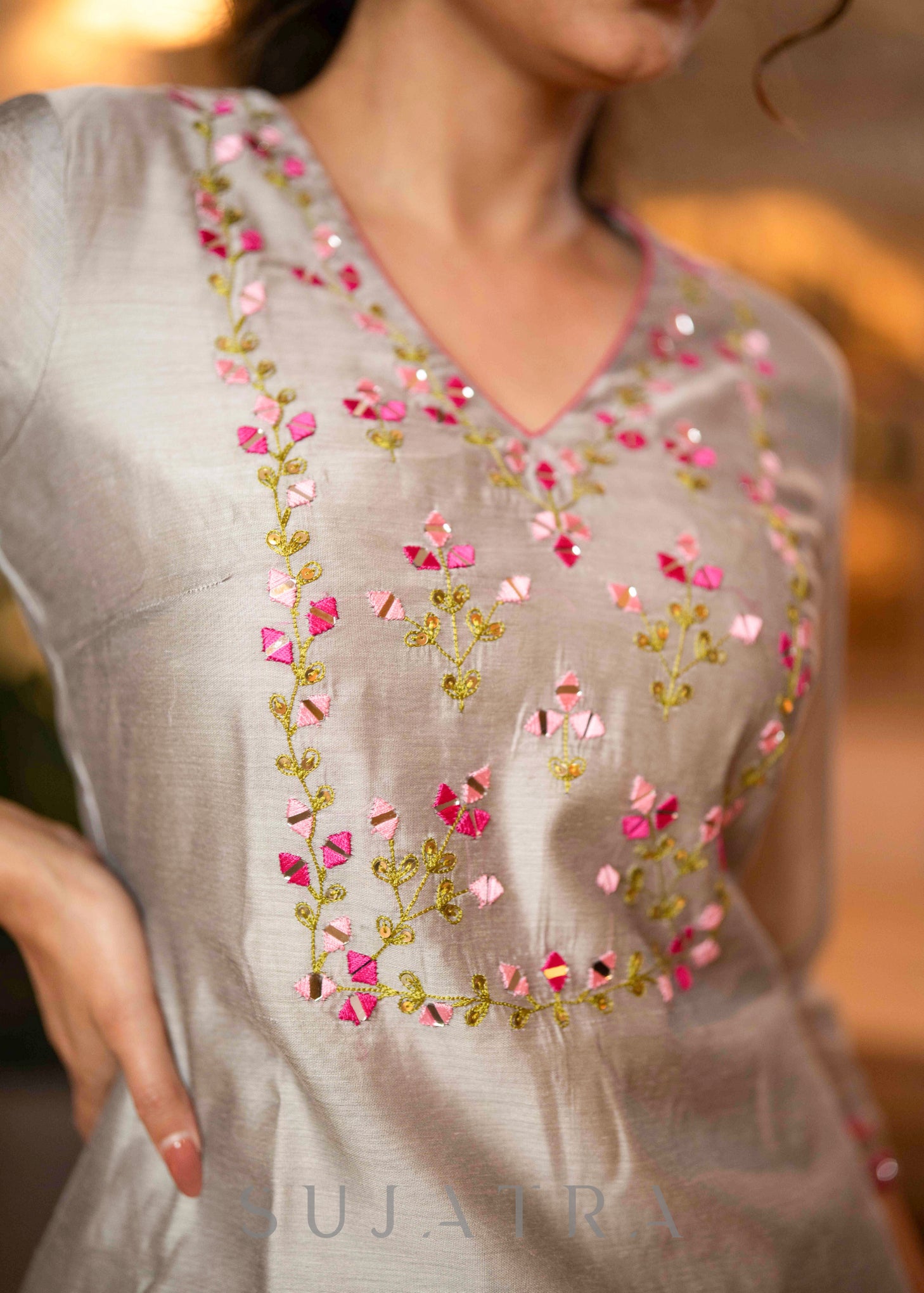 Beautiful Hand Embroidered Grey Chanderi Kurta
