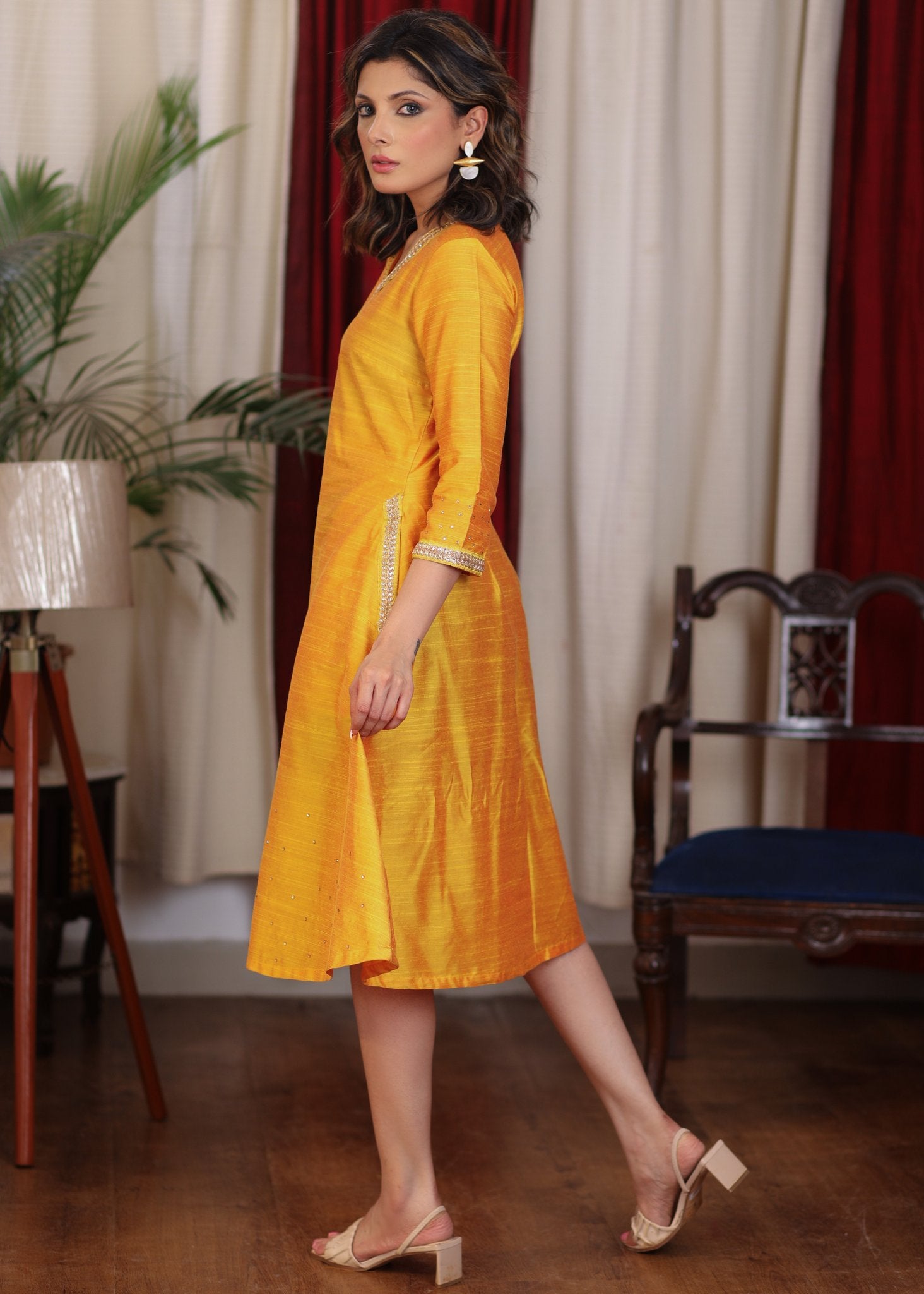 Beautiful mango cotton silk dress with pockets highlighted with zari lace and coin embellishments