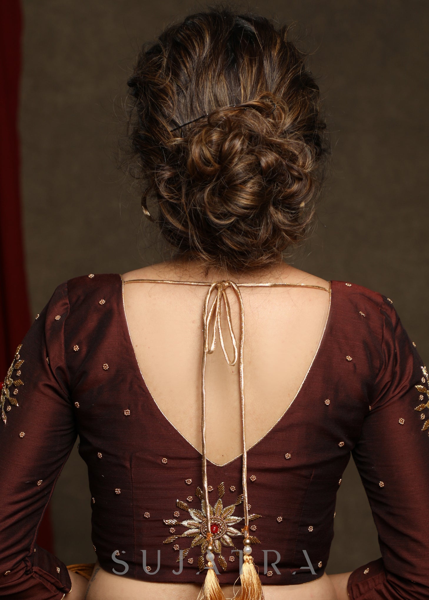 Beautifully Hand Embroidered Coffee Brown Occasion Wear Cotton Silk Blouse - Optional Plain Saree